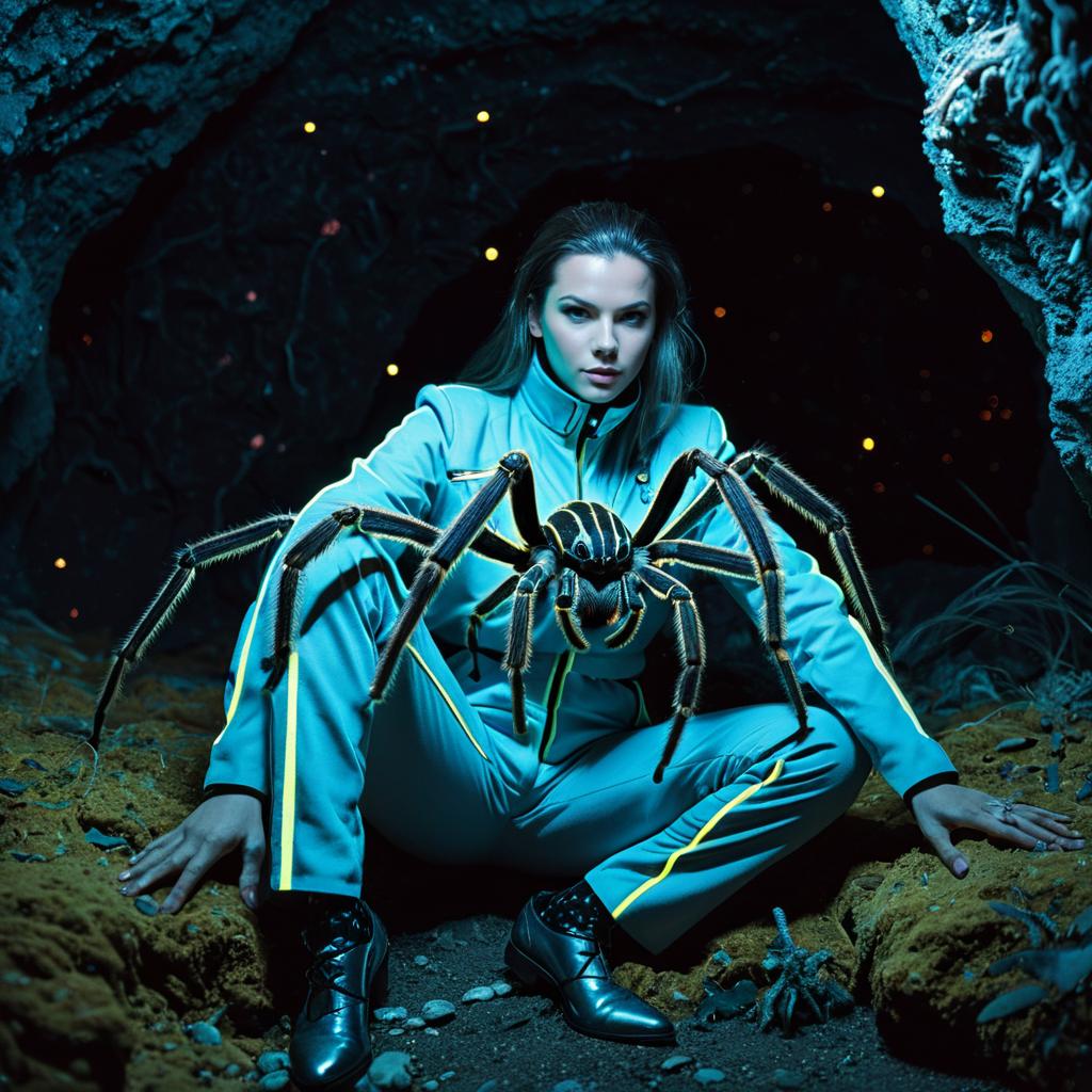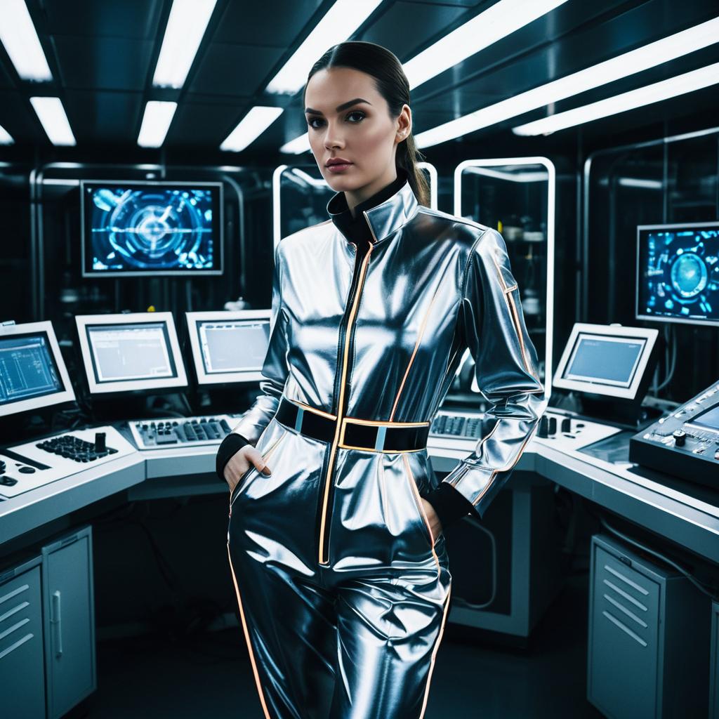 Woman in Silver Jumpsuit in Neon-Lit Underground Station