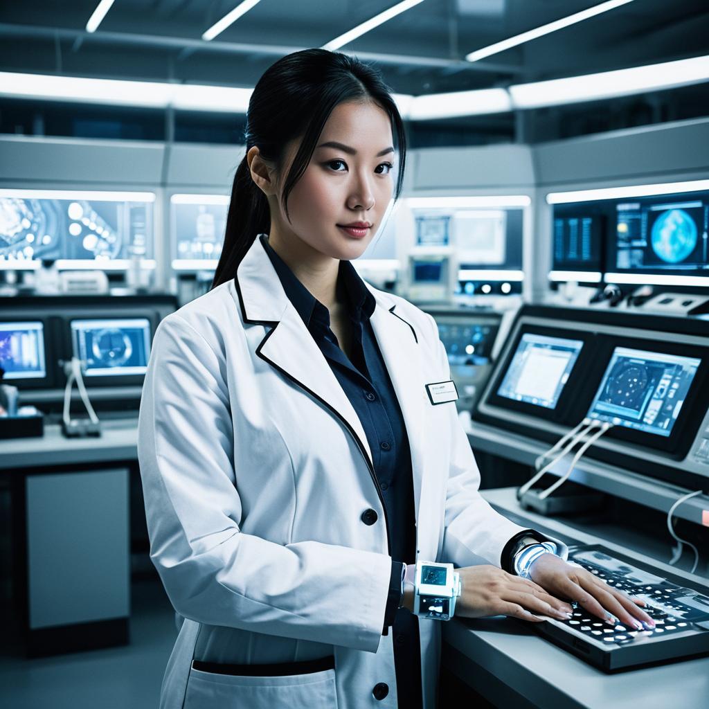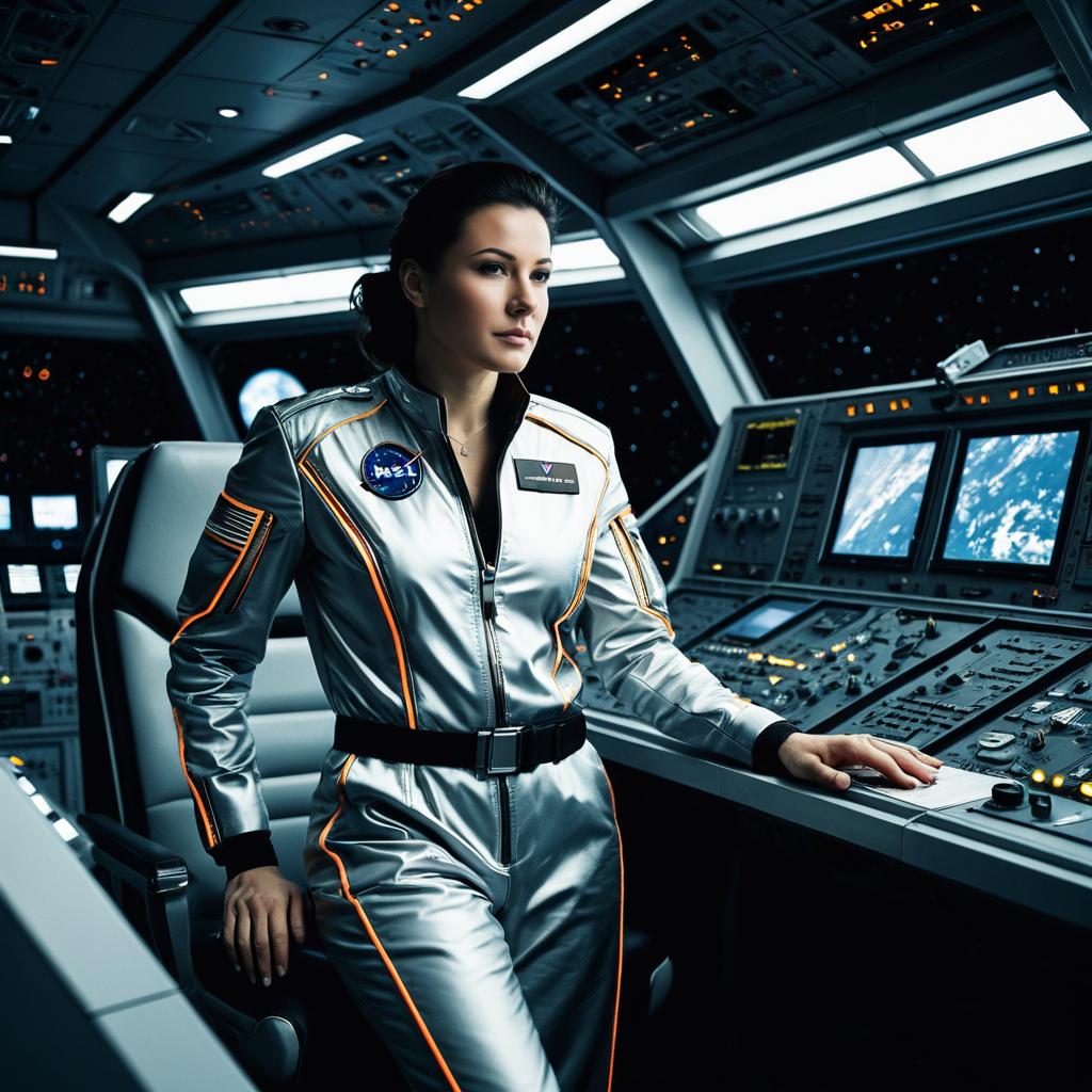 Cyberpunk hacker, posed in underground neon-lit city street, wearing a tailored silver jumpsuit with neon piping and chrome accessories, photorealistic with warm volumetric lighting softly illuminating her flawless skin, captured with a Leica 50 mm f/1.2 at f/2.8 ISO 400 1/125 s in the style of Edward Steichen.