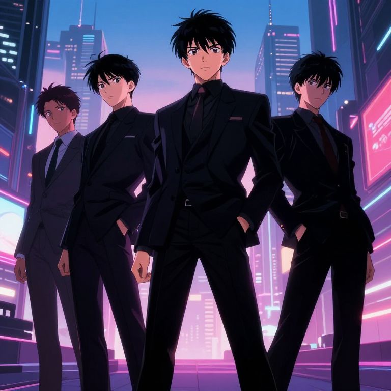 Anime characters with suit standing confidently in a futuristic cityscape at dusk, neon lights reflecting off sleek black suits, dynamic poses, detailed facial expressions, vibrant color palette blending cyberpunk aesthetics with traditional anime style.