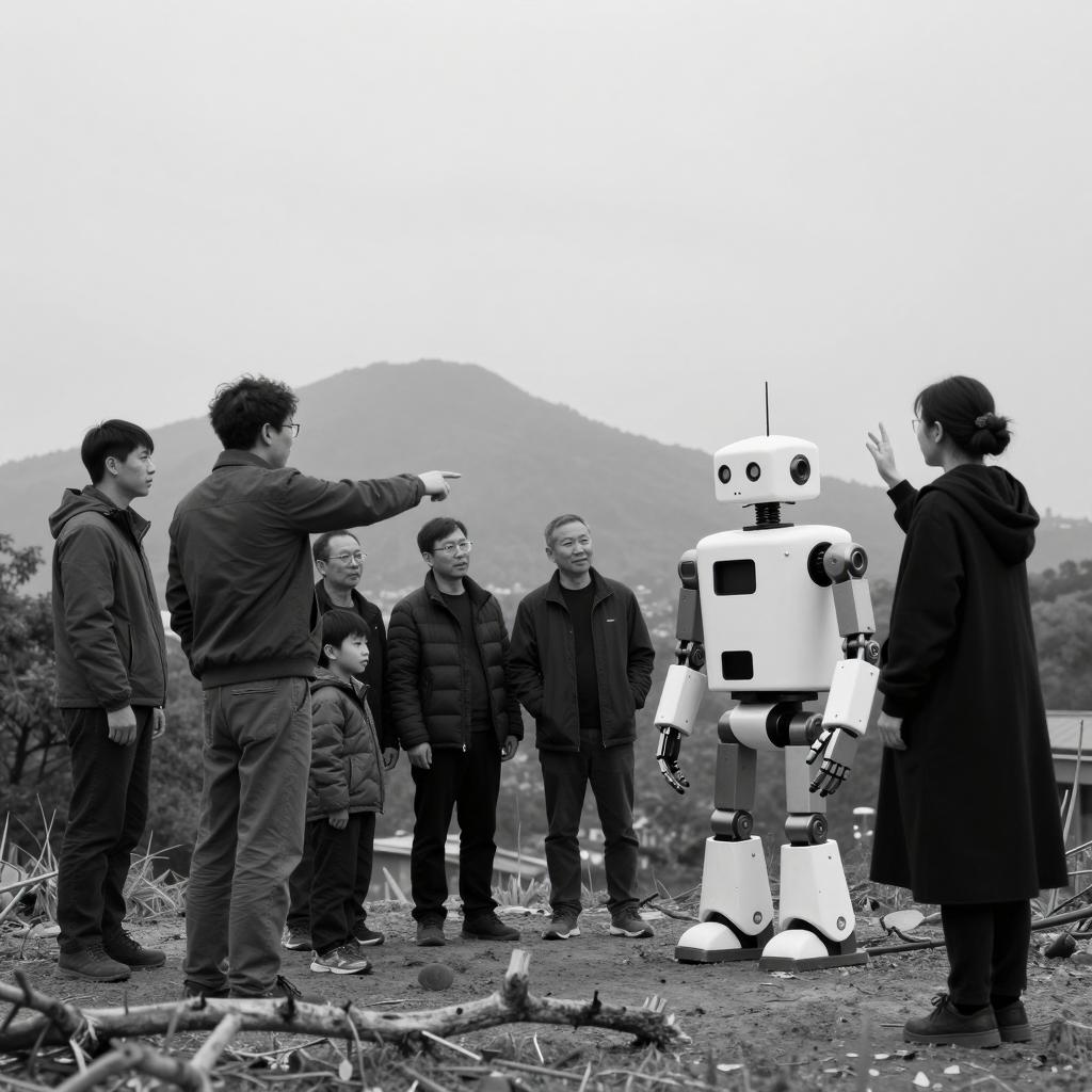 Six people stand around a black, spherical droid with a transparent dome. Three men in brown military-style uniforms and hats, one man in a tan uniform, and one woman in a pink dress. A large, transparent globe is on the left. The droid is positioned at a table in the center. All men smile or look at the droid. The background has dark, industrial lighting and metal structures.