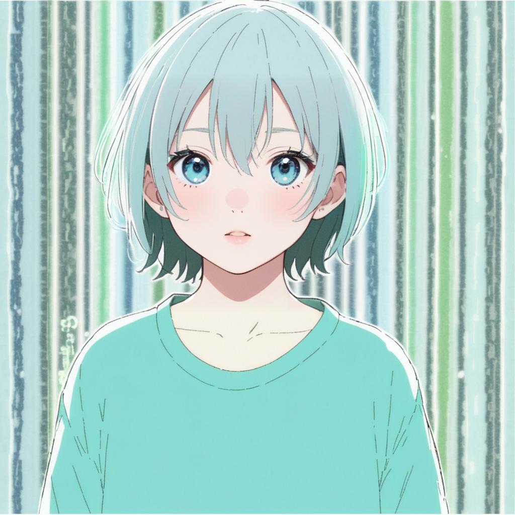 Close-up digital illustration of an anime-style girl with short aqua green hair and large vibrant blue eyes. She wears a light grey jacket with a bright aqua collar over a polka-dot patterned top. The background features a colorful pattern of varying circles in blue, green, black, and grey hues, complementing the character's hair and eyes.