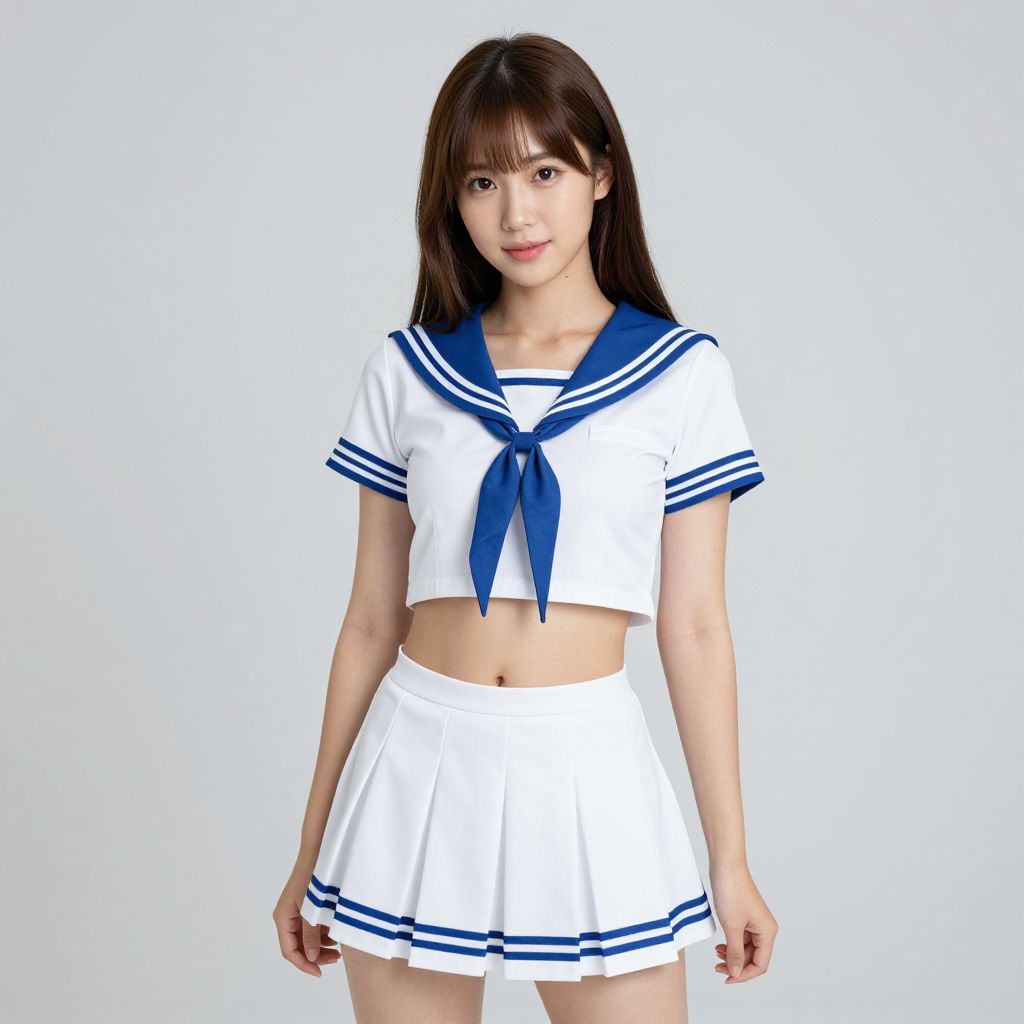 Photograph of an Asian woman with straight brown hair, wearing a white Japanese schoolgirl outfit with blue sailor collar and skirt, standing against a plain white
