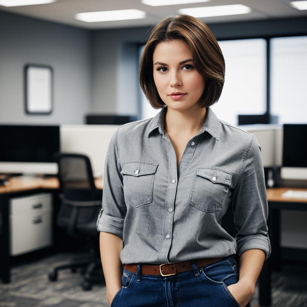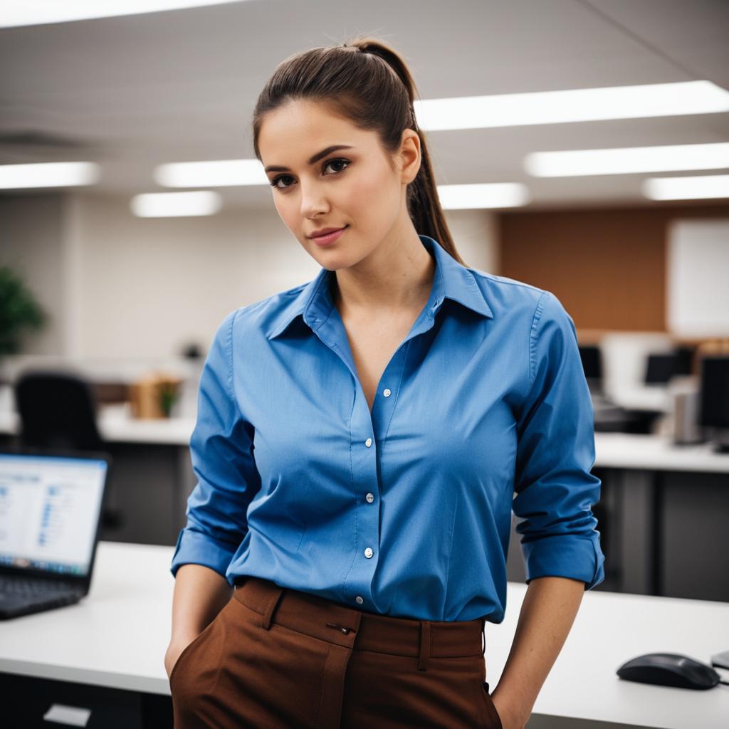 Portrait of a young professional woman with brown hair tied in a ponytail wearing a blue button-up shirt and brown pants, standing confidently in a modern office environment with a blurred background of computer desks.