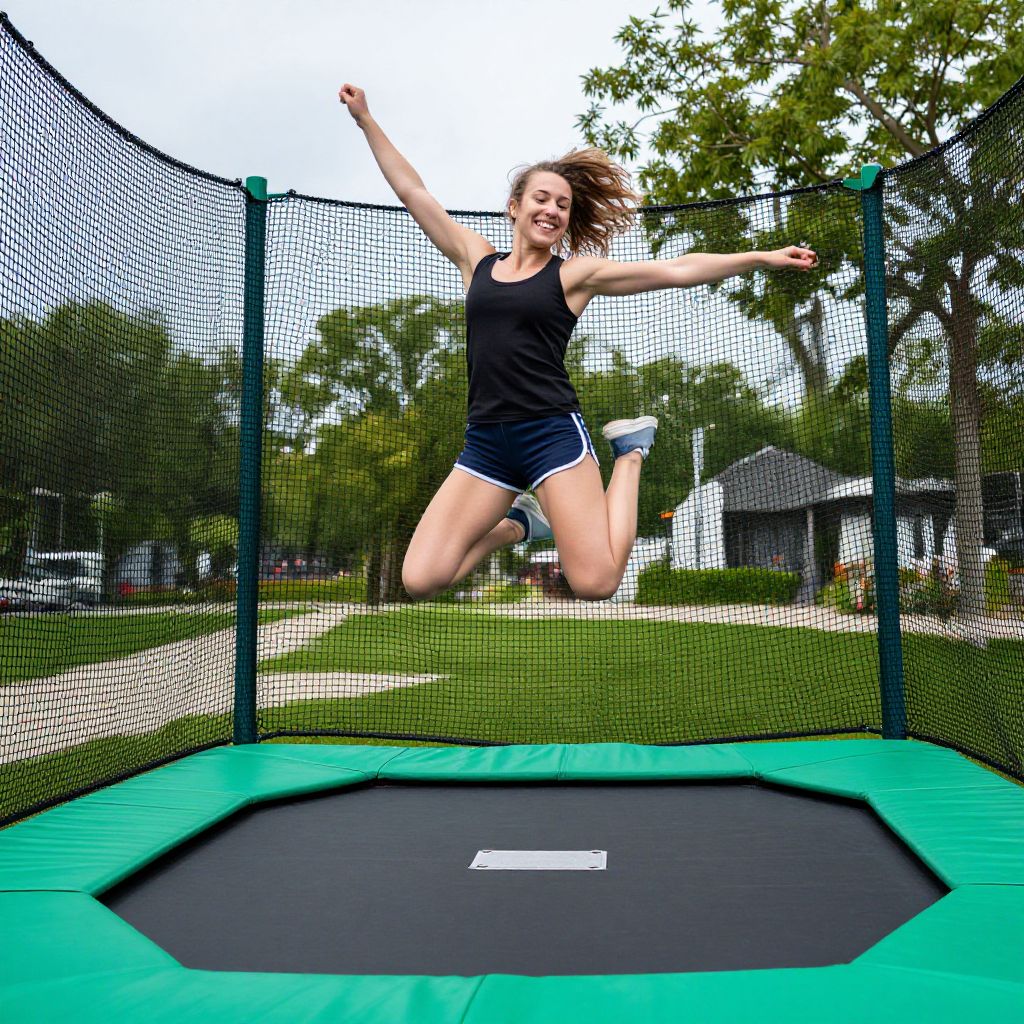 Energetic young woman leaping joyfully on a vibrant green trampoline surrounded by a protective net in a serene outdoor fitness park.