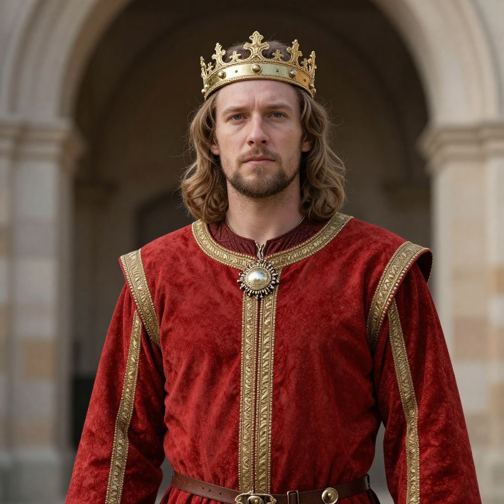 Photograph of a Caucasian man with shoulder-length brown hair and a trimmed beard, wearing a golden crown with intricate designs. He is dressed in a rich, red velvet medieval-style tunic with gold trim and a large, ornate brooch at the center of his chest. The background features an arched stone doorway with beige and gray patterned stones. The man stands confidently, looking slightly to the left with a serious expression. The lighting is natural, highlighting the textures of the fabric and the crown.