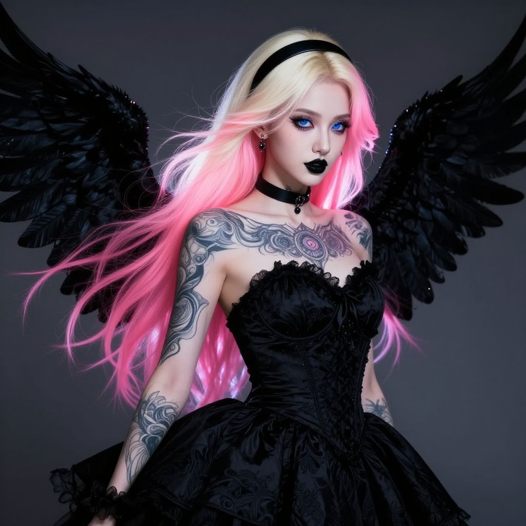 Photorealistic digital artwork of a pale-skinned woman with long, pink and white gradient hair, wearing a black lace corset dress and black feathered wings. Her vivid blue eyes contrast with her black lipstick. She has intricate black and gray tattoos covering her shoulders and upper arms. A black choker adorns her neck. The background is a solid dark gray, highlighting her ethereal and gothic appearance. The image exudes a dark, fantasy, and slightly eerie vibe.