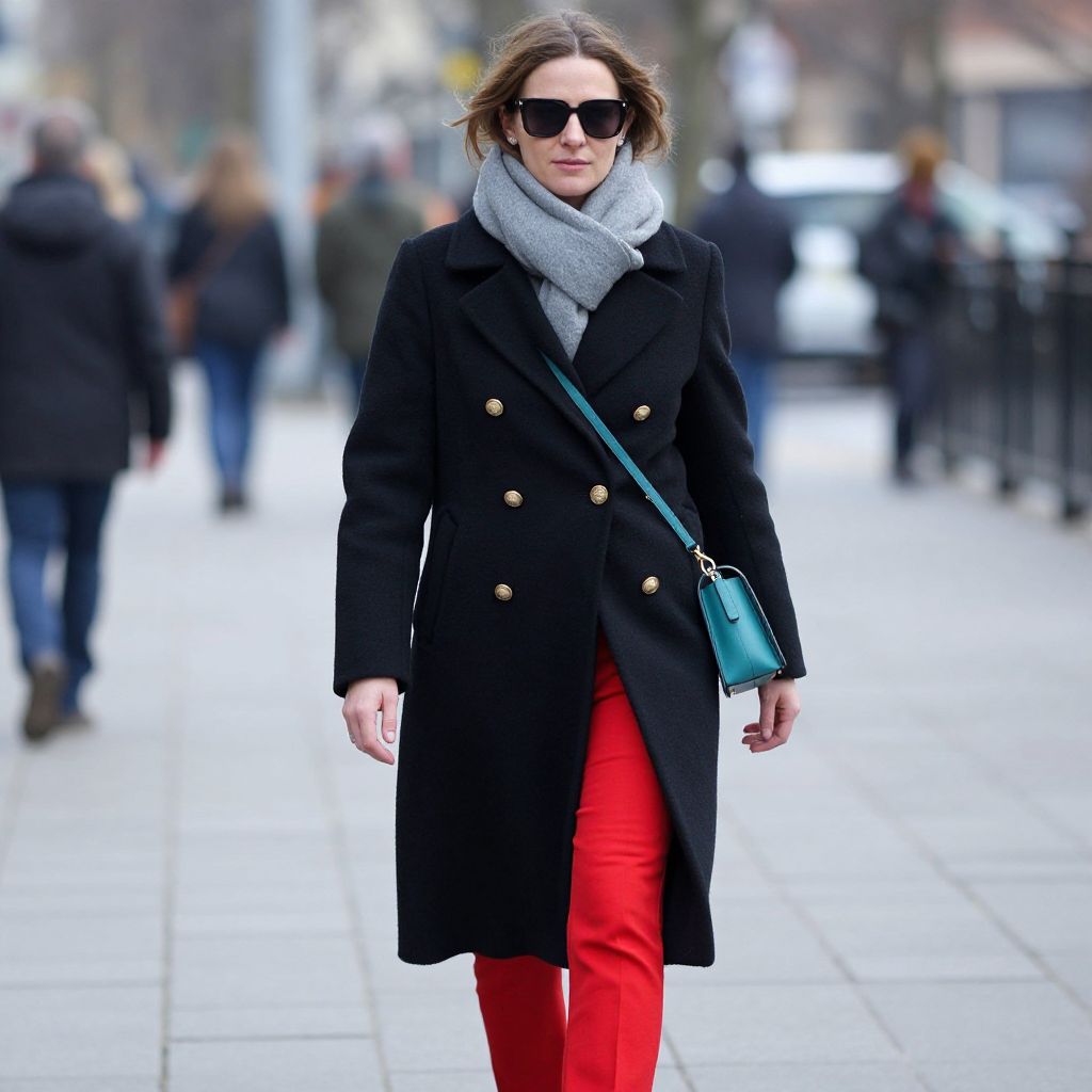 Stylish woman walking down a city street wearing a black double-breasted coat with gold buttons, paired with vibrant red pants, a gray scarf, and accessorized with sunglasses and a teal crossbody bag.