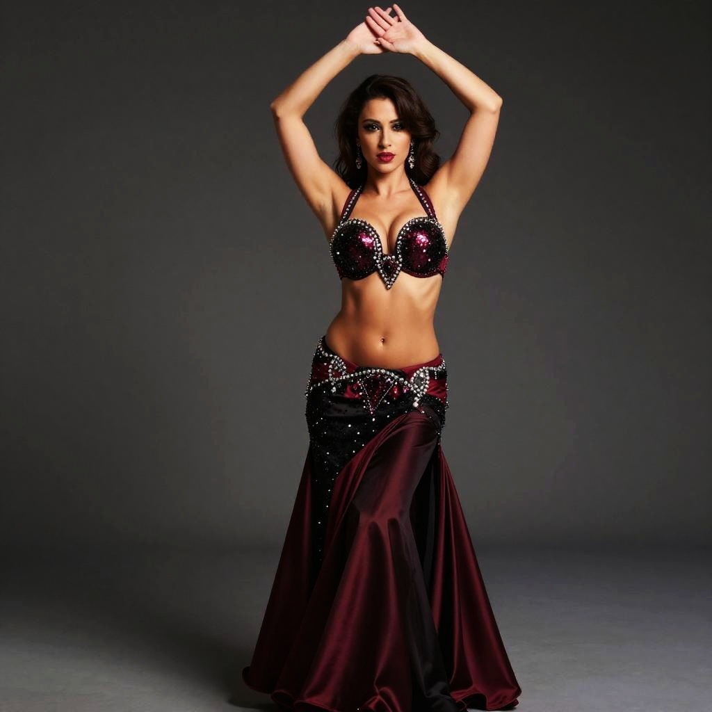 Belly dancer outfit, worn by young girl, featuring embellished bra top and flowing skirt, in vibrant turquoise and silver, captured in artistic dance portrait.