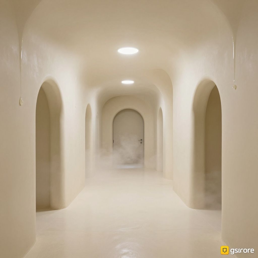 ASCII((indoors, vertical chamber, cavern, organic room, rounded floors, curved walls and doorways, paths leading upward, polished floors and walls, smooth walls, clean walls, clean ceiling, cream colored, liquid dripping from the walls, steam rising from floor)), clean lines, highly detailed, high quality, ((semi-realistic)), best quality, rating: gscore_9, score_8_up