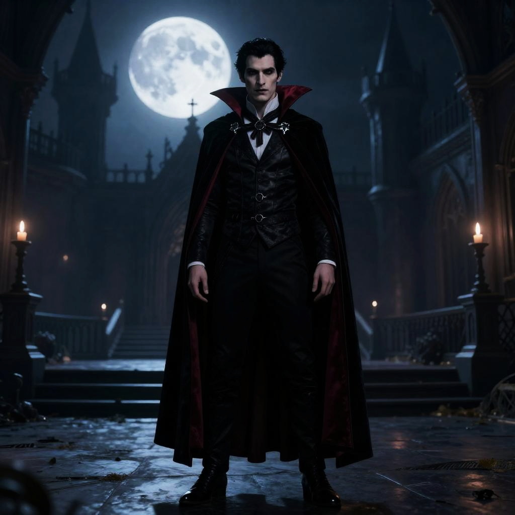 A hyper-realistic digital render of an elderly male priest dressed in a majestic scarlet robe richly embroidered with gold, standing inside a grand cathedral with intricate stained glass windows and soft mystical light filtering through. The man appears wise and solemn, adorned with detailed golden accessories including a large medallion and belt. The cathedral interior features ornate candelabras and classical architecture.