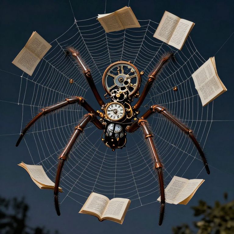 A giant clockwork spider, powered by book pages, weaves new stories into its web every night, erasing forgotten ones each dawn.