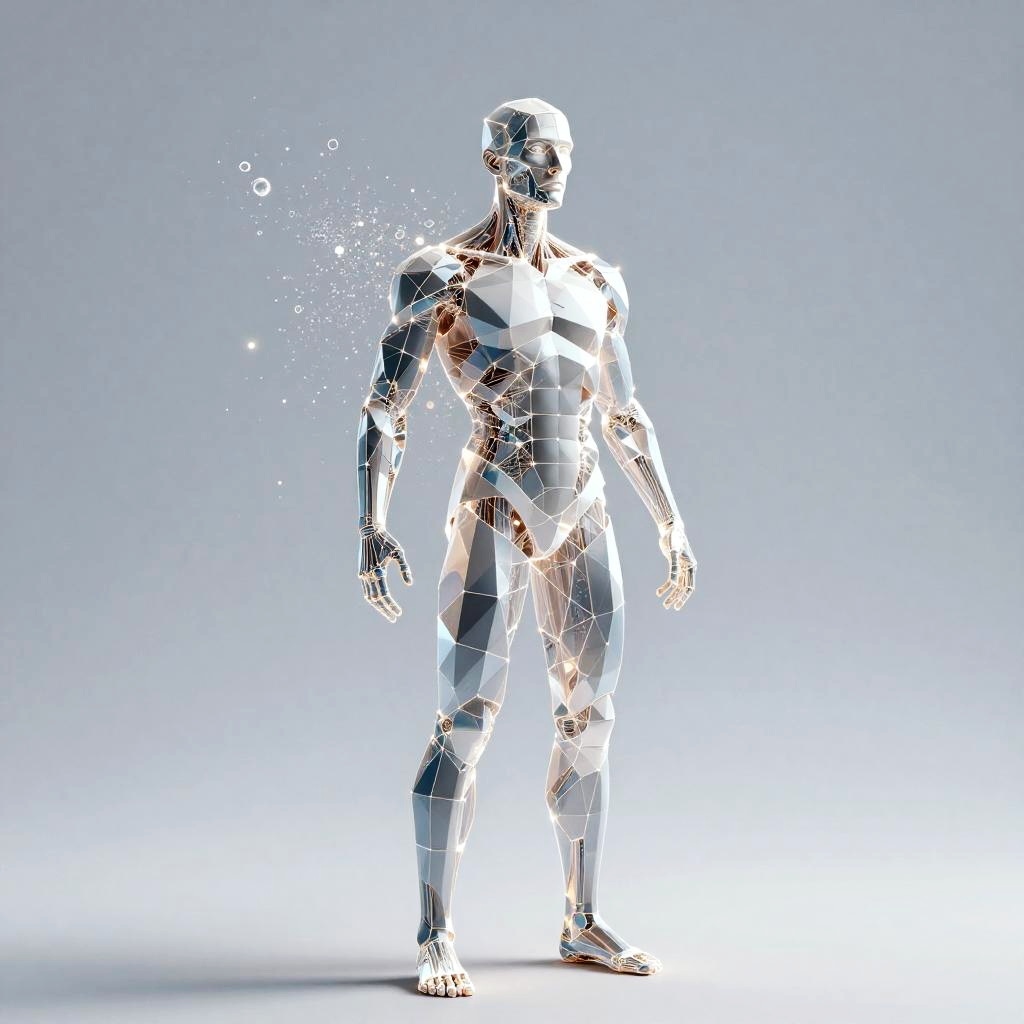 AI body generator free visualization, artistic interpretation of an AI constructing a human anatomy from floating polygons and light particles, dynamic composition, modern digital art, clean background, emphasizing innovation and artificial intelligence