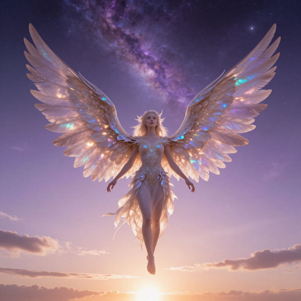 Create a surreal, dreamlike CGI-rendered digital artwork that merges the ethereal qualities of Magritte's The Son of Man with a futuristic cityscape at twilight. From an aerial perspective, depict a young woman possessing piercing silver eyes and iridescent wings, gracefully poised atop a sleek skyscraper. She is adorned in an ethereal dress intricately woven from starlight, contrasting against the neon-lit windows reflecting on her translucent wings. As the sun descends below the horizon, the cityscape transforms into a vibrant tapestry of warm hues and pulsating lights, casting elongated shadows that intertwine with the silhouettes of distant celestial bodies, evoking a sense of wonder and curiosity for the enigmatic expanse beyond our world.