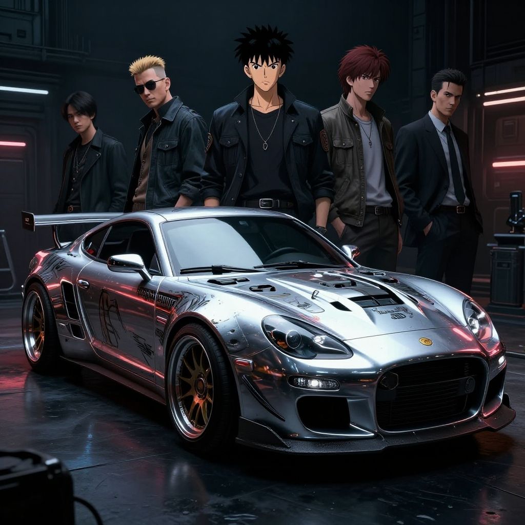 Custom car, anime style, chrome details, spy gadgets, dark dystopian world, gangster vibes, gritty, sci-fi, high-tech, epic, volumetric lighting, realistic reflections, few neon lights, 70mm lens, ray-tracing, art by ghibli, akira, don lawrence, syd mead, moebius, alex ross