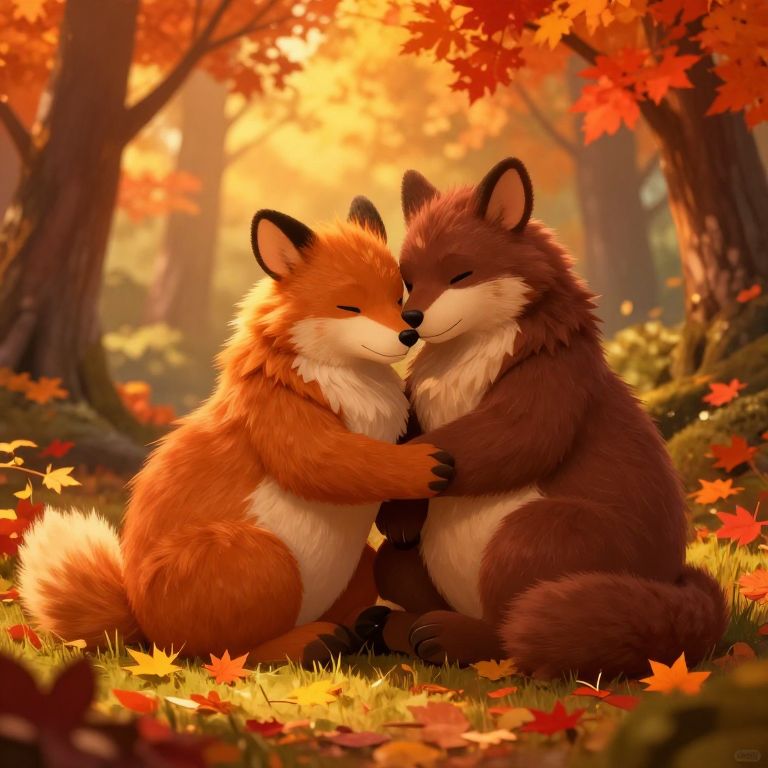 Digital art of two fluffy, cuddling foxes with orange and brown fur, sitting in an autumn forest with vibrant red leaves.