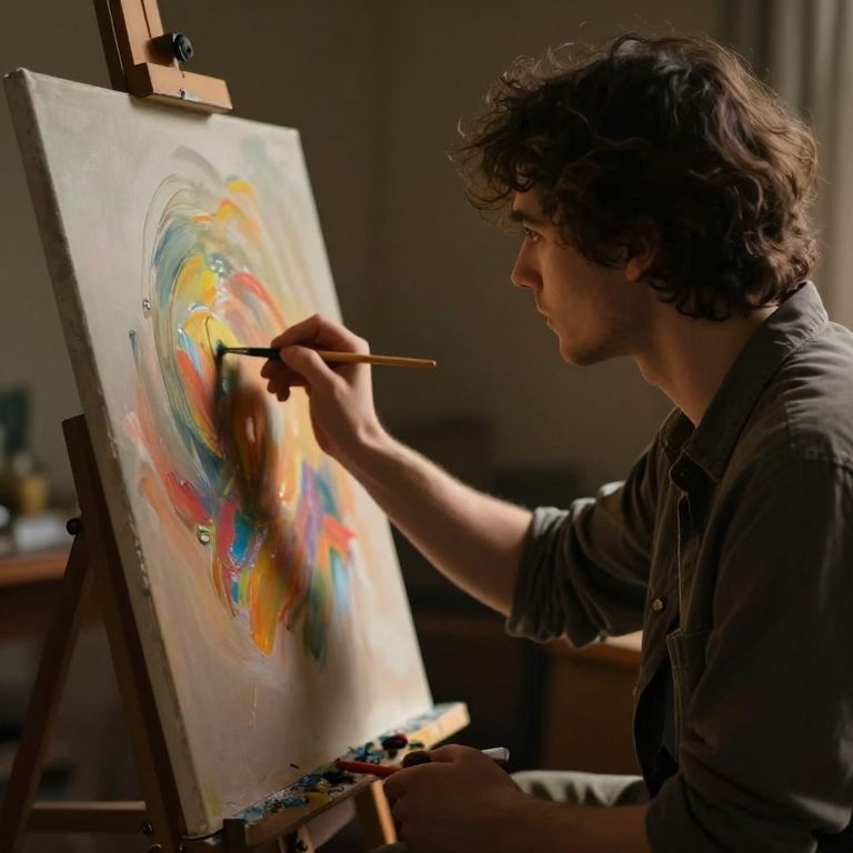 A photograph captures a young man with wavy brown hair and a fair complexion, painting on an easel. He wears a dark, button-up shirt, and holds a paintbrush in his right hand, applying vibrant colors—yellow, red, blue, and green—to a swirling abstract painting on a white canvas. The easel is wooden with a black clamp, and a palette with various paints is on the lower left. The background is blurred, featuring indistinct dark furniture and soft light from a window on the right. The image focuses on the artist's concentrated expression and the dynamic, colorful artwork.