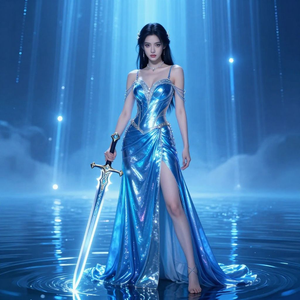 A fantasy-themed female warrior stands confidently in water wearing a flowing, metallic blue gown. She holds an ornate sword that glows with light, and the scene is illuminated with ethereal blue lighting and reflections. The background features vertical beams of blue light, creating a mystical, otherworldly atmosphere.
