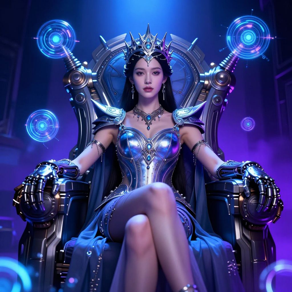 Photograph of a dark-haired woman standing confidently in a blue, metallic, strapless gown with a high slit, revealing her right leg. She holds a glowing blue sword in her right hand. The background is a radiant blue light show with beams and mist, creating an ethereal atmosphere. Her expression is intense, and the gown reflects light, adding a shimmering effect. She is barefoot on a reflective, water-like surface. The overall style is fantasy or sci-fi, with a dramatic, otherworldly vibe.