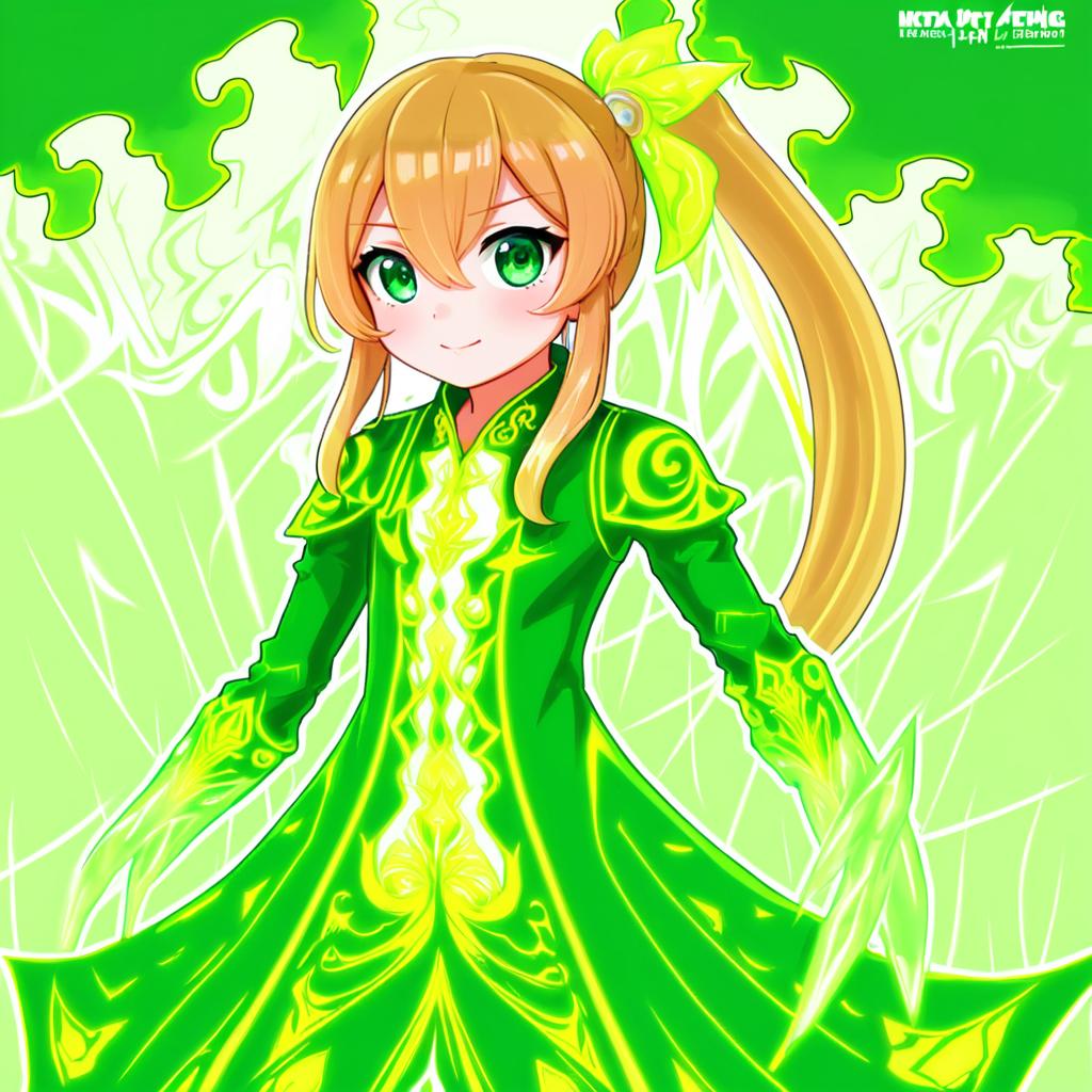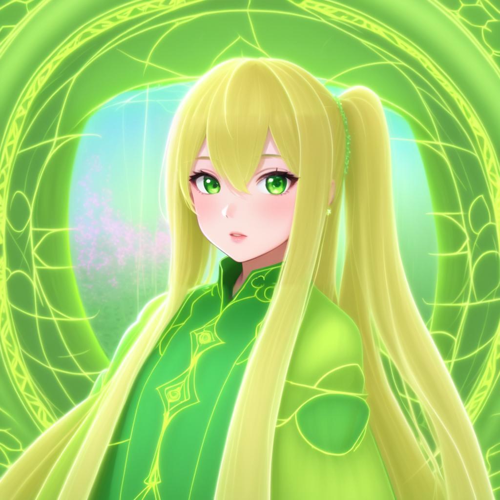 Digital anime-style portrait of a young female character with striking green eyes and long blonde hair styled in a side ponytail. She is dressed in a detailed green outfit with glowing accents. The background features an ethereal green circular pattern, adding a mystical atmosphere to the image.
