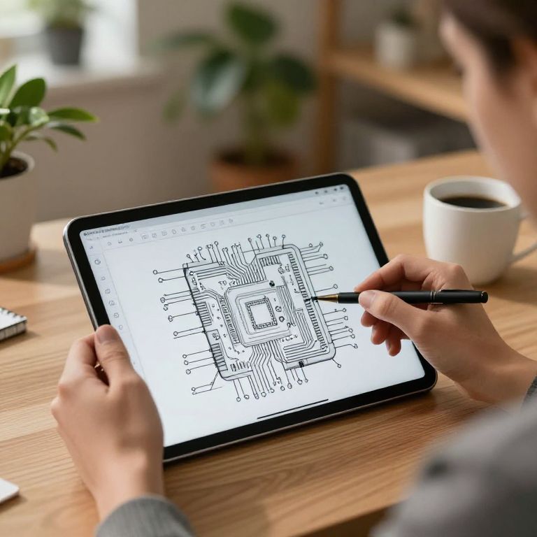 Creative professional using free online CAD drawing tool on tablet, sketching intricate circuit board layout, cozy home office background with plants and coffee cup, warm tones, photo-realistic with soft shadows.