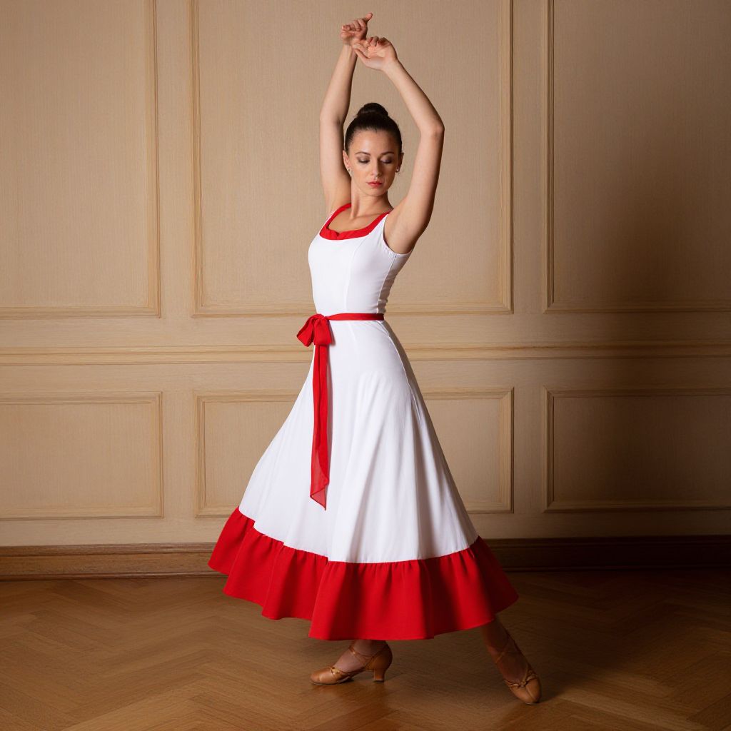 "Tarantella Dance Dress, woman in a white and red dress standing in a room"