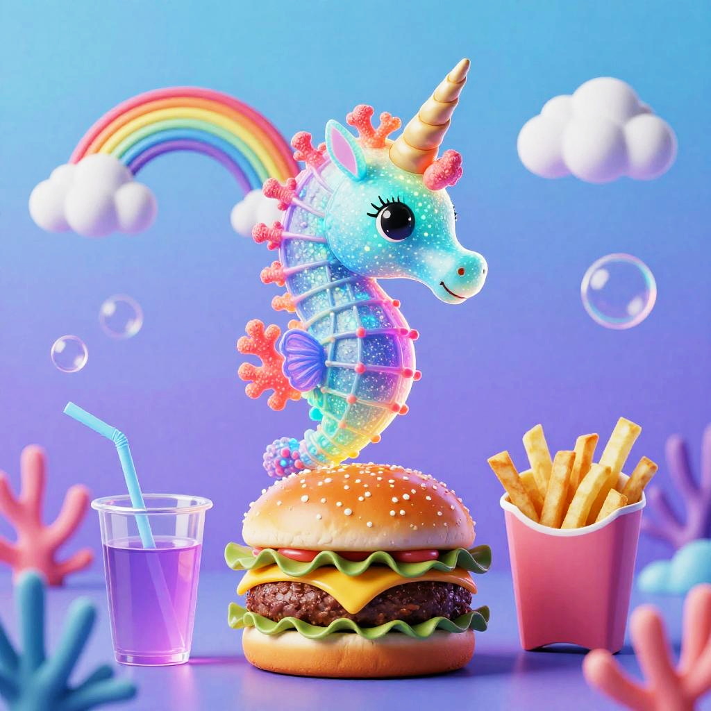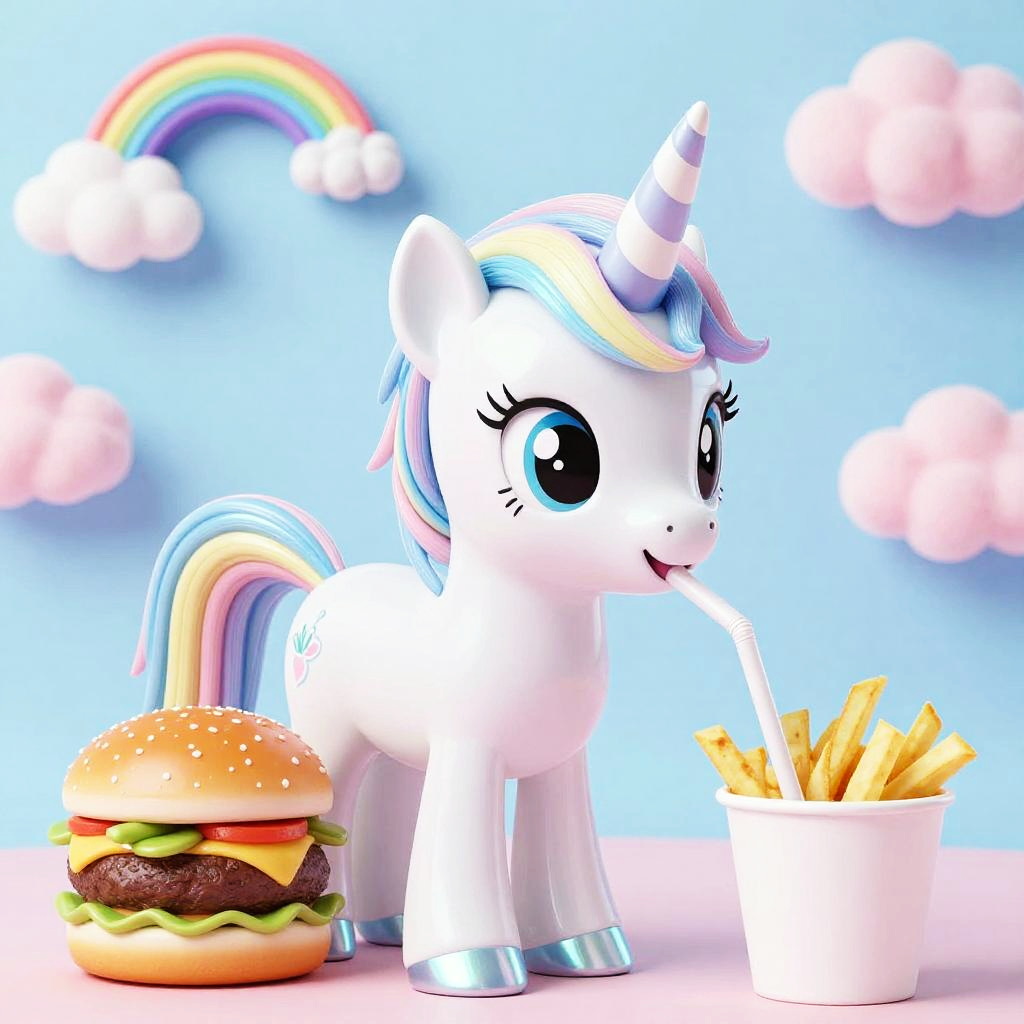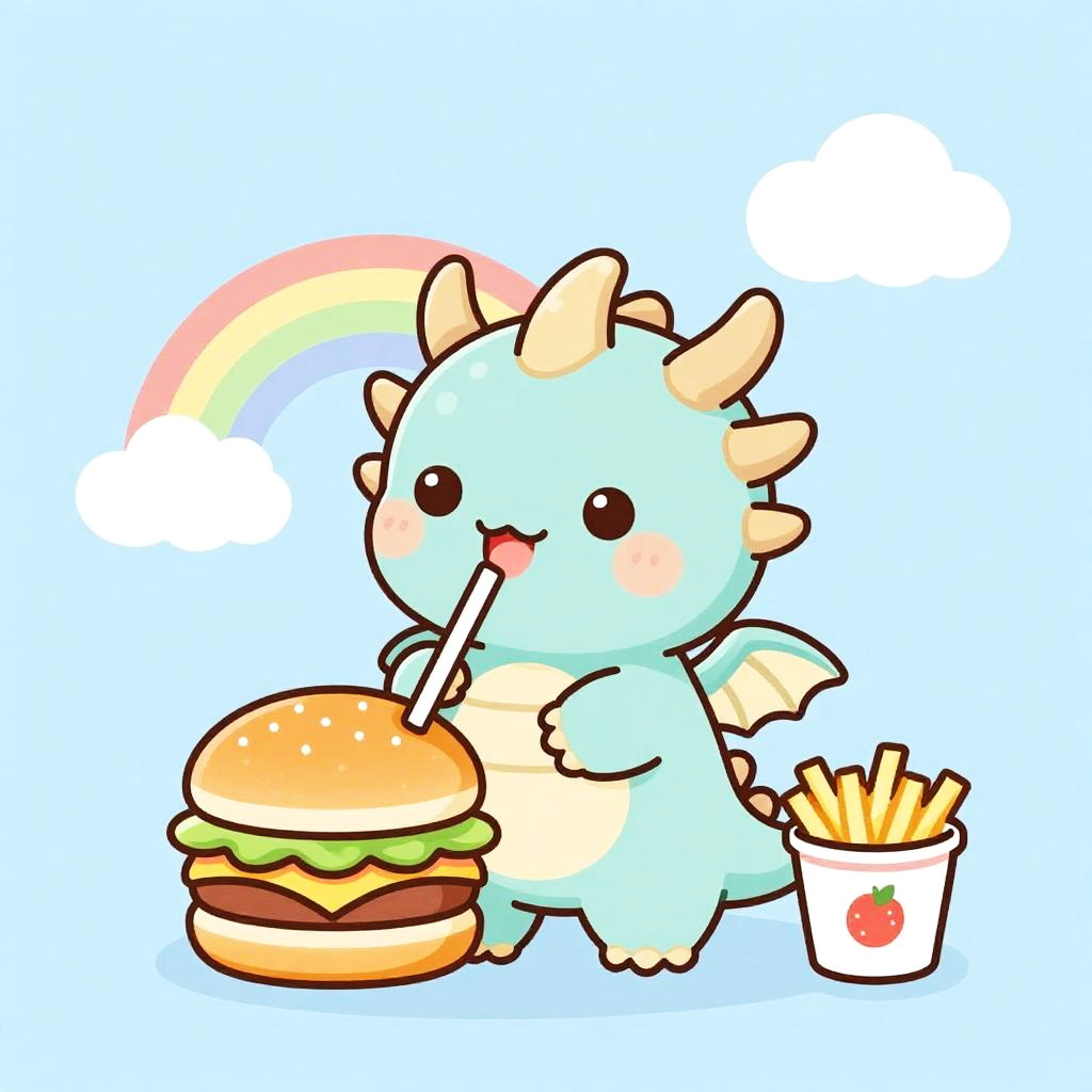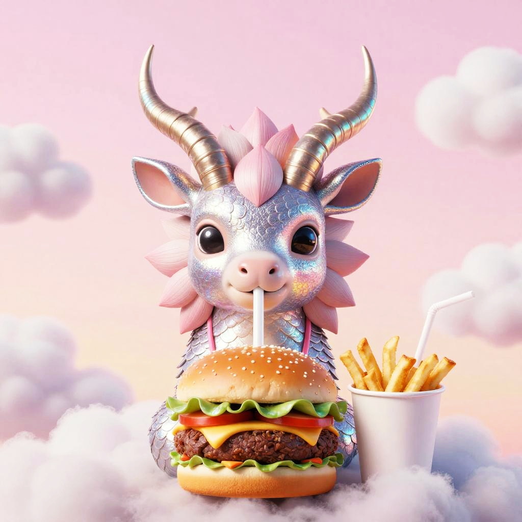 No humans, food, pastel stegosaurus-unicorn hybrid (uni-saurus) with a single pearlescent horn and pastel rainbow plates, rainbow, burger, cloud, drinking straw, sunrise peach-to-lilac gradient background with soft fluffy clouds, horns, solo, smile, black eyes, cup, french fries, single horn, drink, uni-saurus (pastel stegosaurus-unicorn hybrid)