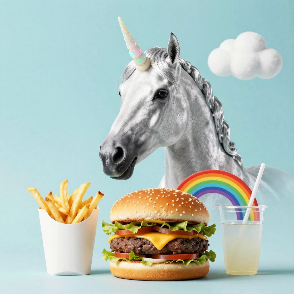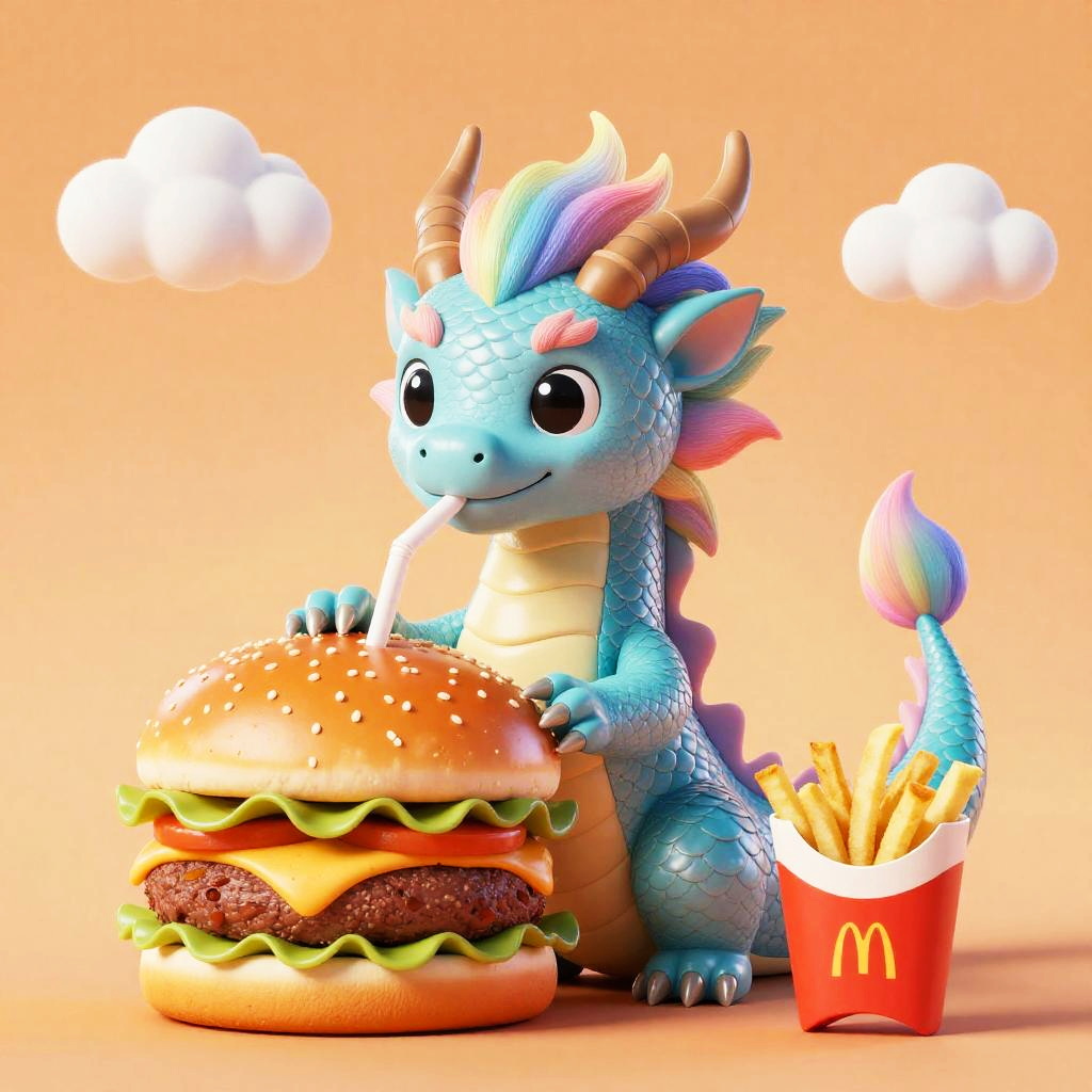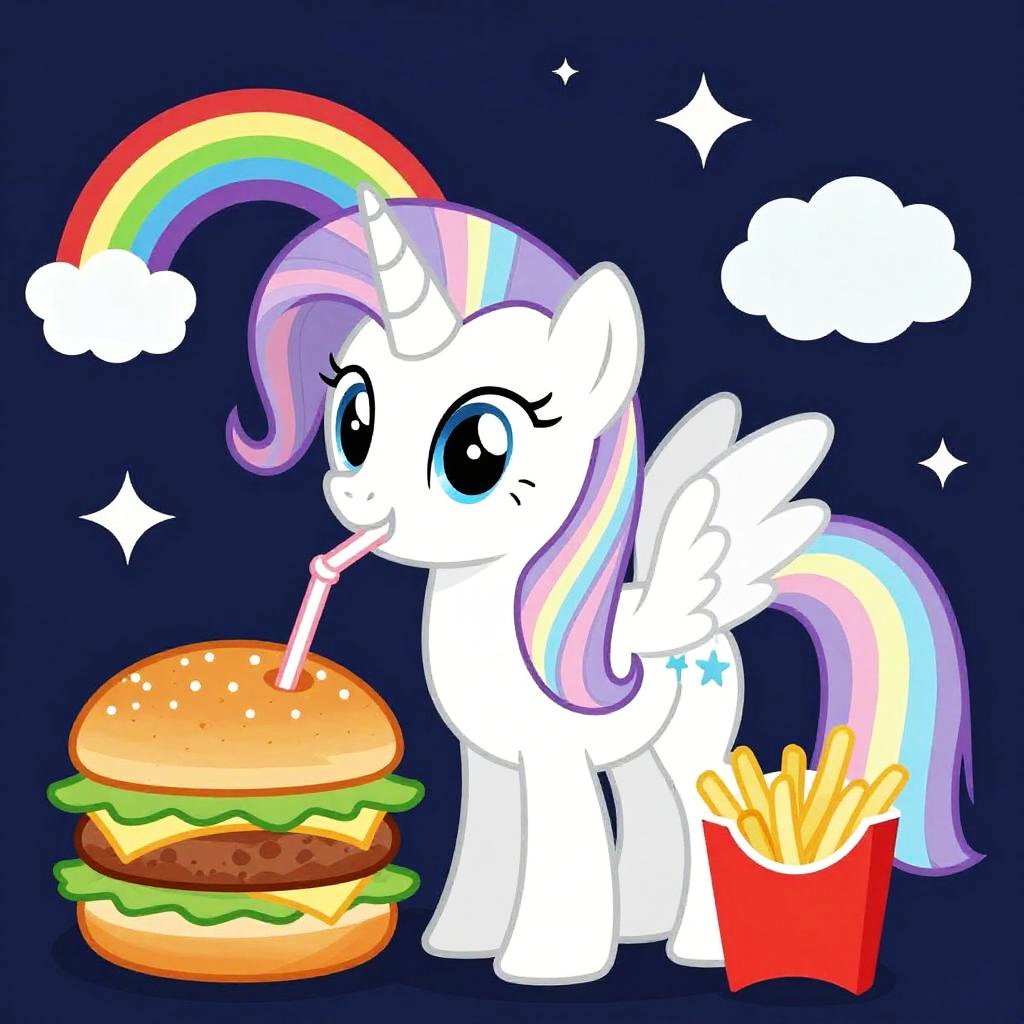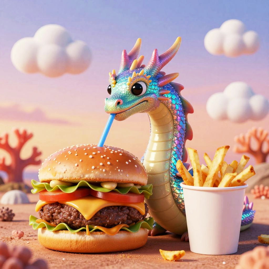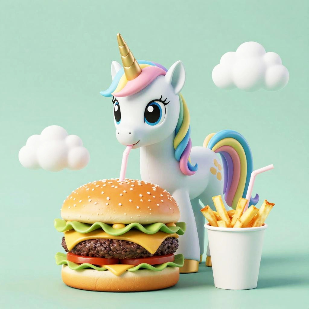 No humans, food, pastel stegosaurus-unicorn hybrid (uni-saurus) with a single pearlescent horn and pastel rainbow plates, rainbow, burger, cloud, drinking straw, sunrise peach-to-lilac gradient background with soft fluffy clouds, horns, solo, smile, black eyes, cup, french fries, single horn, drink, uni-saurus (pastel stegosaurus-unicorn hybrid)