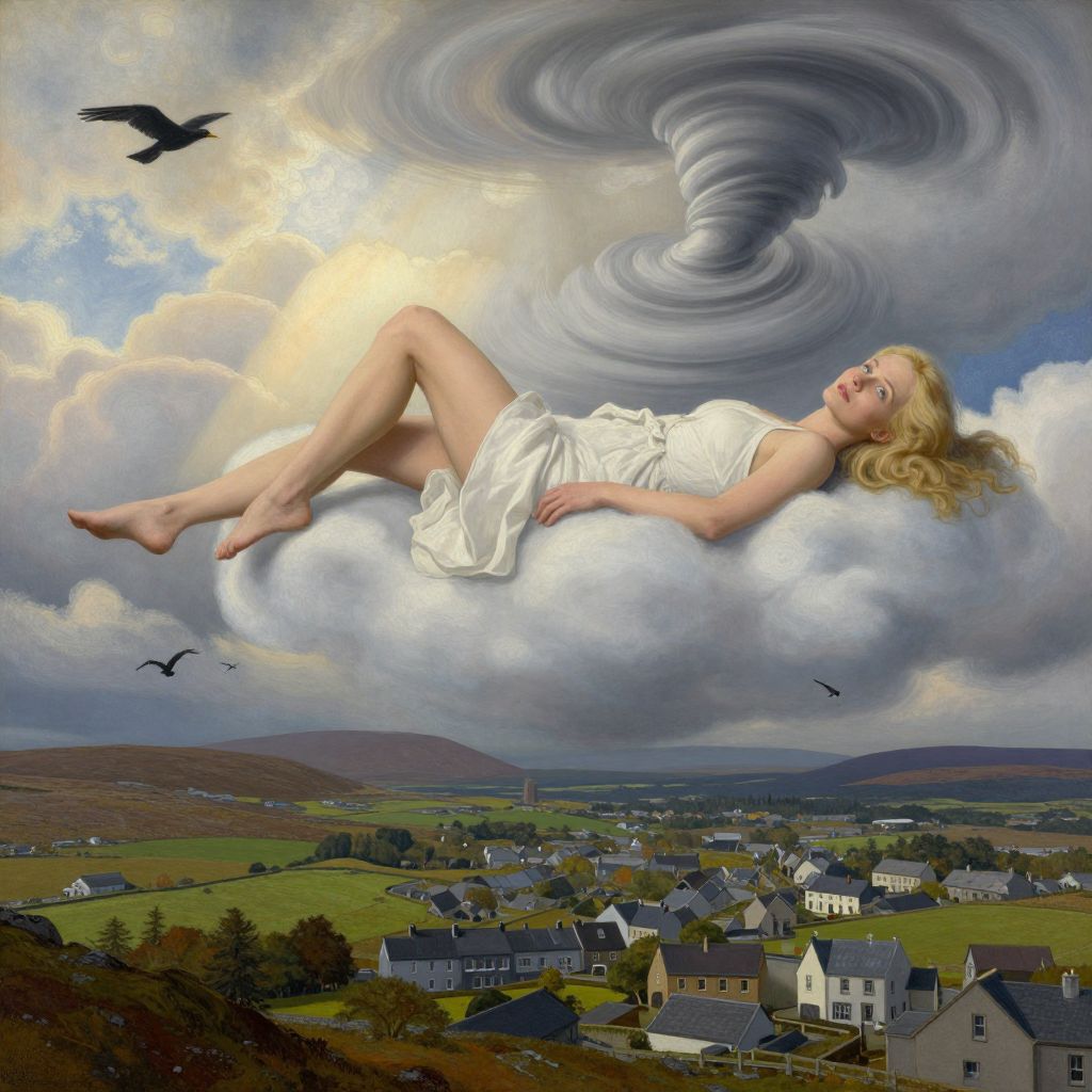 The image is a richly detailed, surreal collage drawing by Richard Hamilton, featuring a beautiful woman with blonde hair and blue eyes, lying on a cloud in the sky. She has long legs and is barefoot, wearing a white dress. The town below consists of various houses and buildings, with black birds flying around and a whirlwind or hurricane in the background. The sky is a mix of soft colors, with sunbeams shining through the clouds, creating a serene yet dynamic atmosphere. The overall composition is elegant and highly detailed, with a sense of movement and volumetric lighting that enhances the depth and realism of the scene. The Irish landscape, with its rolling fields and mountains in the background, adds to the surreal and creative quality of the artwork.