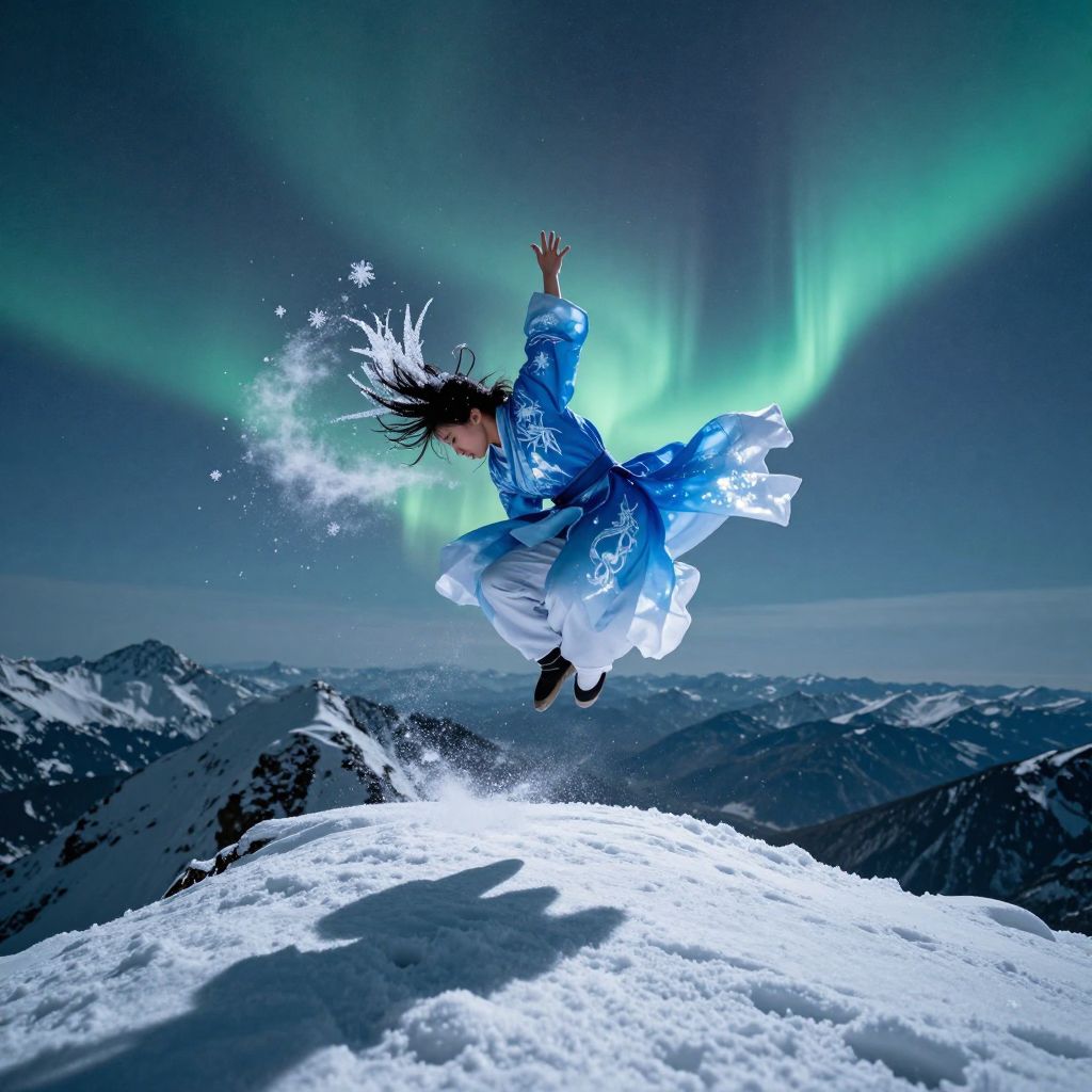 A skilled female airbending master performs an acrobatic flip atop a mountain peak covered in pristine snow, her blue attire etched with mesmerizing ice patterns reflecting the dazzling aurora borealis overhead. From a high vantage point, we observe her elegant mid-air movement, as her cascading hair transforms into shimmering icicles and her frosty breath forms delicate crystalline snowflakes swirling around her. The scene is illuminated by ethereal moonlight, casting dramatic shadows that emphasize the fluid motion and unwavering resolve of this martial arts expert, who commands the chilly environment with grace and power.