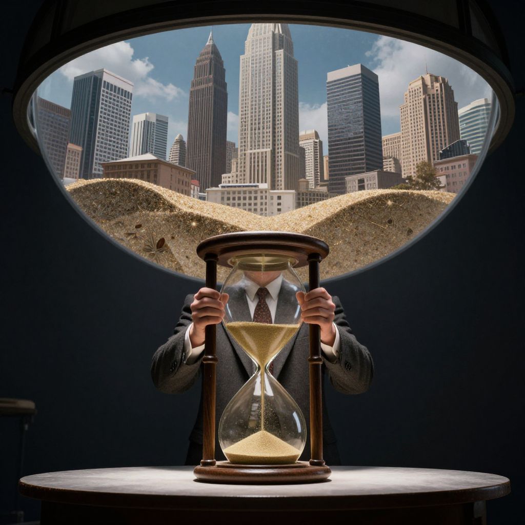 A city suspended within a colossal hourglass experiences time flowing downward during the day and upward at night.