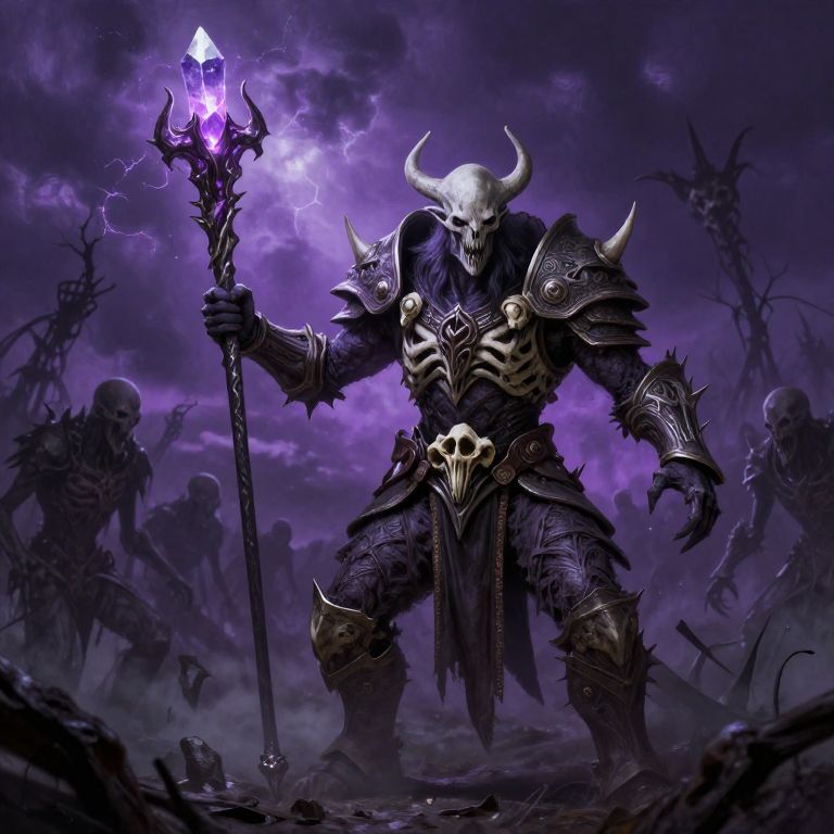 Githyanki necromancer commanding an army of undead under a stormy violet sky, wielding a staff with a pulsating crystal, intricate armor adorned with spiked bones, dramatic composition, dark atmosphere, high detail digital painting.