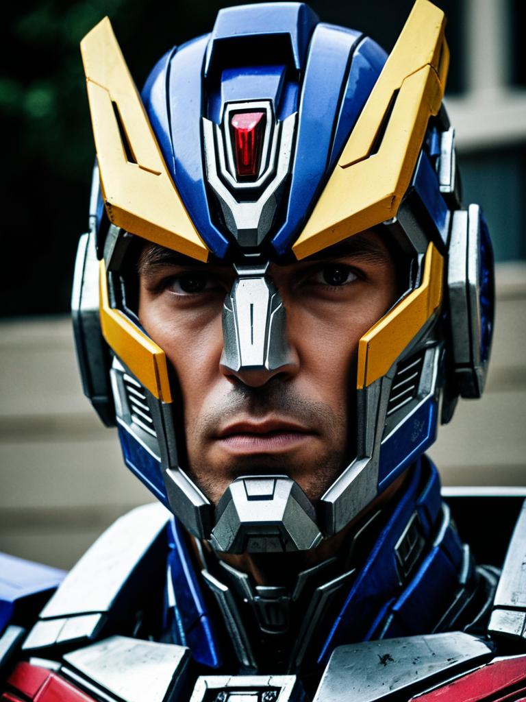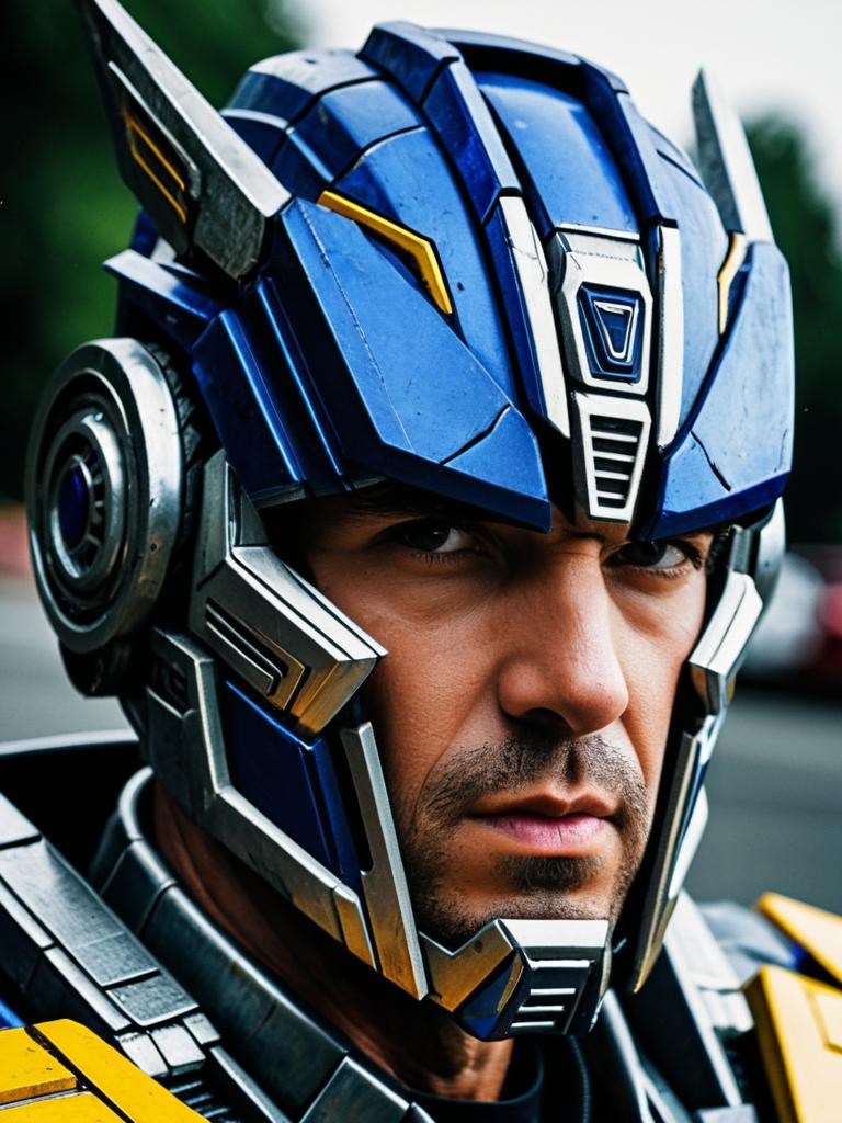 Man in Transformers Costume, close-up detailed headshot, photorealistic realism