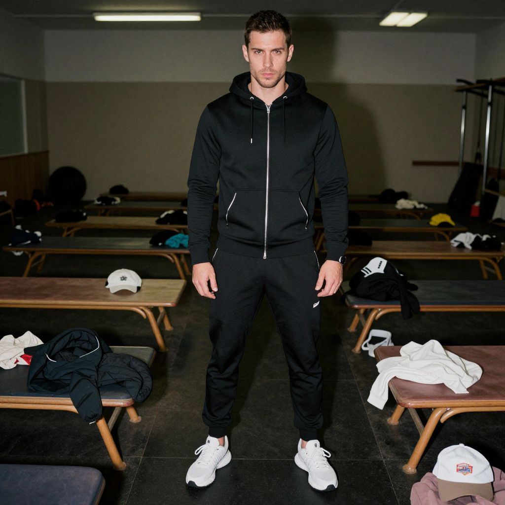 Photograph of a tall, fit young man with short, dark brown hair and a serious expression, standing in a dimly lit locker room. He wears a black hooded sweatshirt with white zippers, black pants, and white sneakers. The background features wooden benches scattered with clothes, including white and black caps, and a faintly visible gym equipment in the shadows. The floor is tiled, and fluorescent lights hang from the ceiling, casting a bright white light on the subject. The overall mood is casual and sporty.