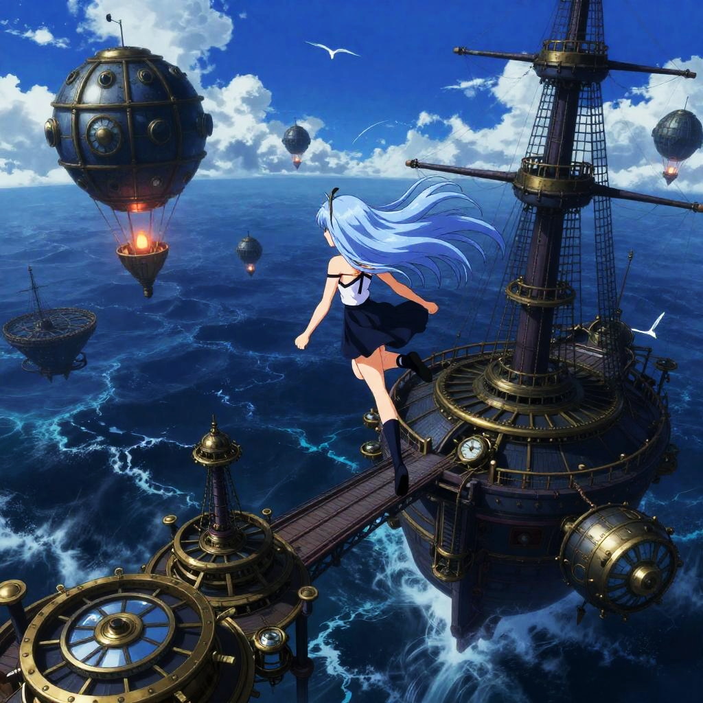 Aerial Valkyrie, Naoe Rei, Surreal, mysterious, bizarre, fantastical, fantasy, sci-fi, Japanese anime, clockwork aerial wharf above a stormy neon sea with drifting lantern zeppelins, miniskirt beautiful swordsman running towards the airship on the tethered rope, perfect voluminous body, blue sky, clouds, detailed masterpiece bird’s eye views