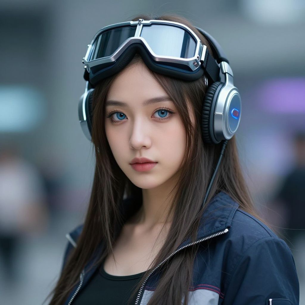 Photograph of a young East Asian woman with long, straight, dark brown hair and blue eyes. She wears black aviator goggles on her head, large silver over-ear headphones with blue accents, and a black jacket with a white stripe on the sleeve. Her expression is neutral, looking slightly to the side. The background is blurred, featuring indistinct urban elements with soft blue and purple hues, suggesting an outdoor city setting. The image has a slightly soft focus, emphasizing her face and accessories. The overall style is modern and slightly futuristic.