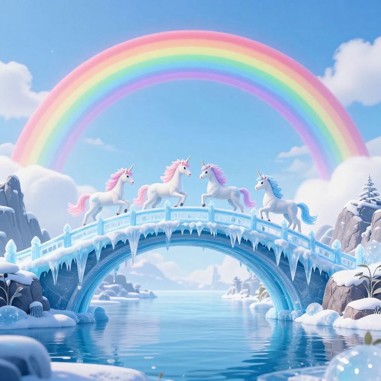 A whimsical 3D-rendered fantasy scene features a magical ice bridge arching gracefully over a serene lake, adorned with cascading icicles and supported by rugged rock formations. Four ethereal unicorns traverse the bridge beneath a vibrant rainbow, their flowing manes and tails adding a touch of enchantment to this high-definition, dreamlike landscape.