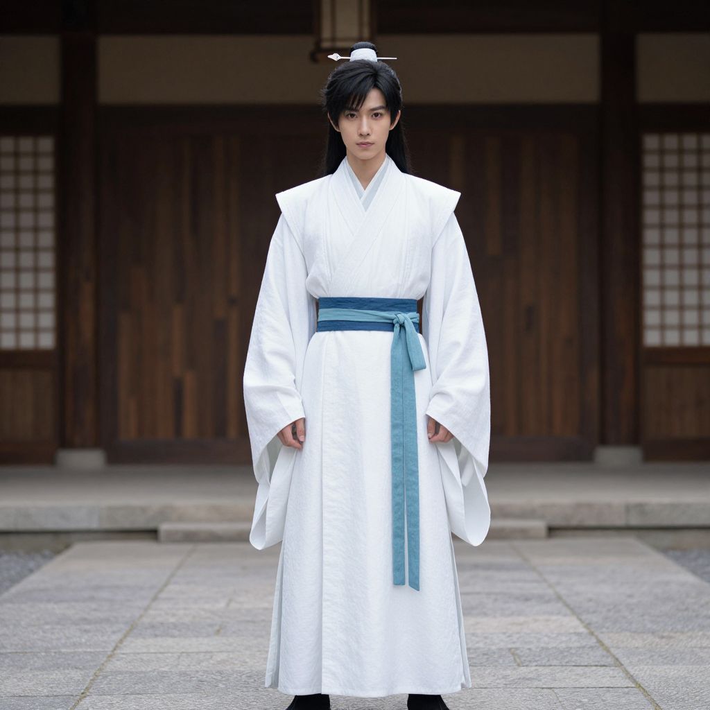 Luo binghe costume, 1boy, solo, male focus, japanese clothes, black hair, standing, realistic, full body, hair ornament, wide sleeves