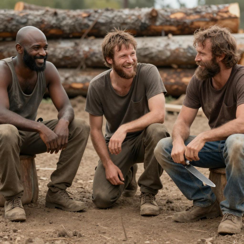 Photograph of three men in a rugged, dirt-covered setting. A bald, dark-skinned man with a beard sits on the left, smiling. A white man with messy brown hair and a beard kneels in the center, laughing. A bearded man with a brown shirt and blue jeans sits on the right, holding a knife. Logs are in the background.