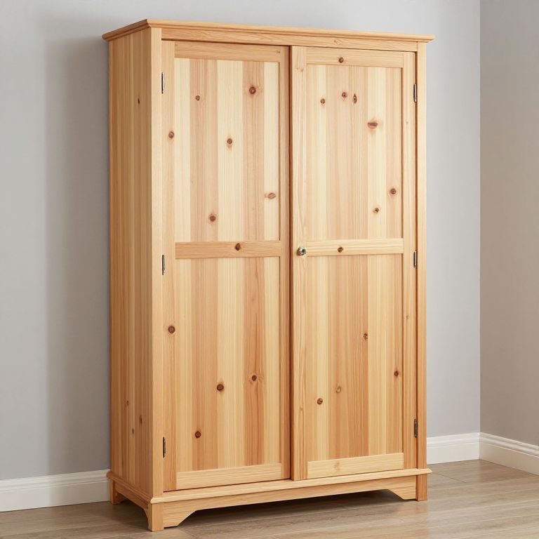A natural pine wooden wardrobe with two doors, featuring visible wood grain and knots. The wardrobe stands on a wooden floor against a light gray wall, showcasing a simple and classic design ideal for home storage and natural texture decor.