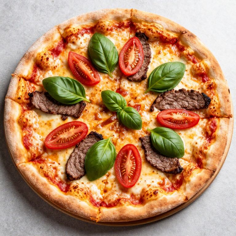 Photograph of a freshly baked pizza on a silver surface. The pizza has a golden-brown crust and is topped with melted cheese, tomato sauce, sliced red tomatoes, fresh basil leaves, and thinly sliced beef strips. The cheese is slightly browned in places, adding a crispy texture. The tomatoes are vibrant red, contrasting with the dark brown of the beef and the green of the basil. The pizza is circular and positioned centrally in the image, with a slight shadow beneath it, giving a sense of depth and realism.
