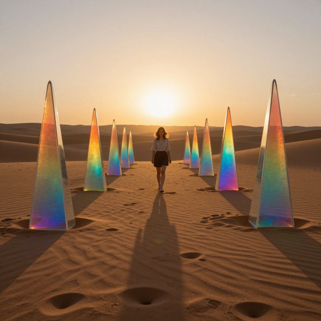 In a surreal desert bathed in the glow of a setting sun, a woman walks between a row of luminous glass prisms that cast vibrant, rainbow-hued shadows across the sand, defying the ordinary laws of light and color.