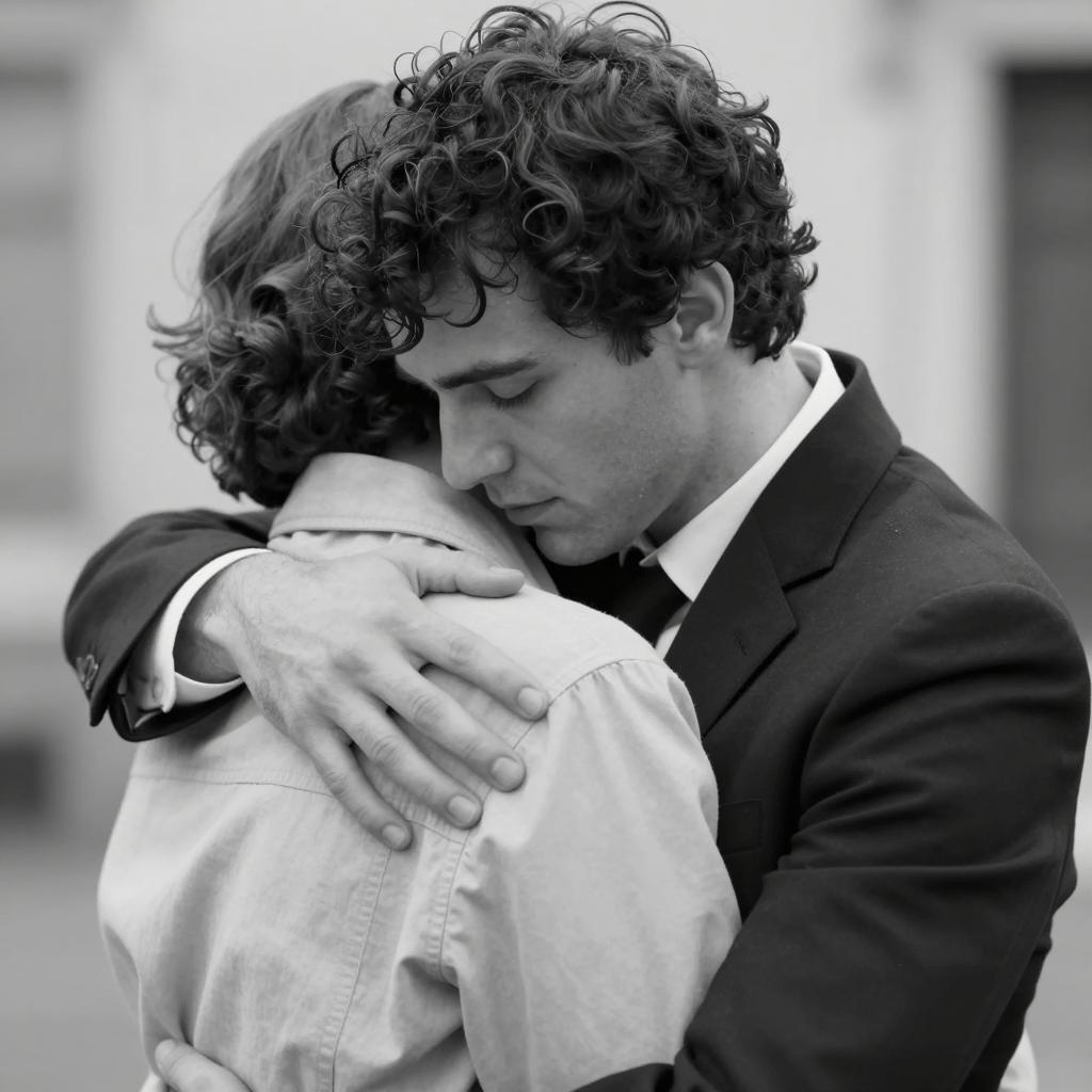 Black and white photo of a man in a light-colored coat and dark pants, leaning forward with hands on a metal fence. He has dark, wavy hair and a neutral expression. The Brooklyn Bridge's intricate steel structure is in the background, with vertical cables and an arch visible. The man is positioned slightly to the left, looking slightly downward. The fence is in the foreground, running horizontally. The background includes the bridge's upper structure and sky.