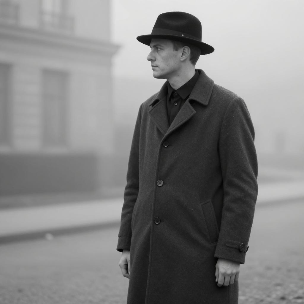 Black and white photo of a Caucasian man with dark, wavy hair wearing a light-colored wool coat and dark pants. He is leaning forward with both hands resting on a metal fence near the water. The iconic Brooklyn Bridge with its steel cables and arch towers is visible in the background, along with urban buildings under an overcast sky.