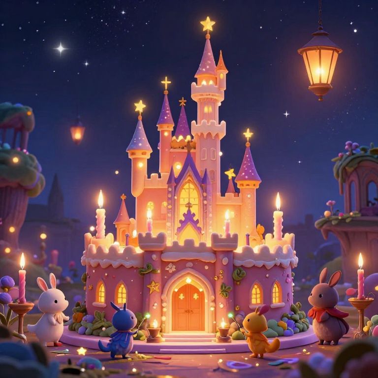 Birthday theme with a magical fantasy twist, a surreal cake shaped like a castle with sparkling candles, mystical creatures celebrating beneath glowing lanterns, a starry night sky, vivid colors and dreamlike atmosphere in detailed digital illustration