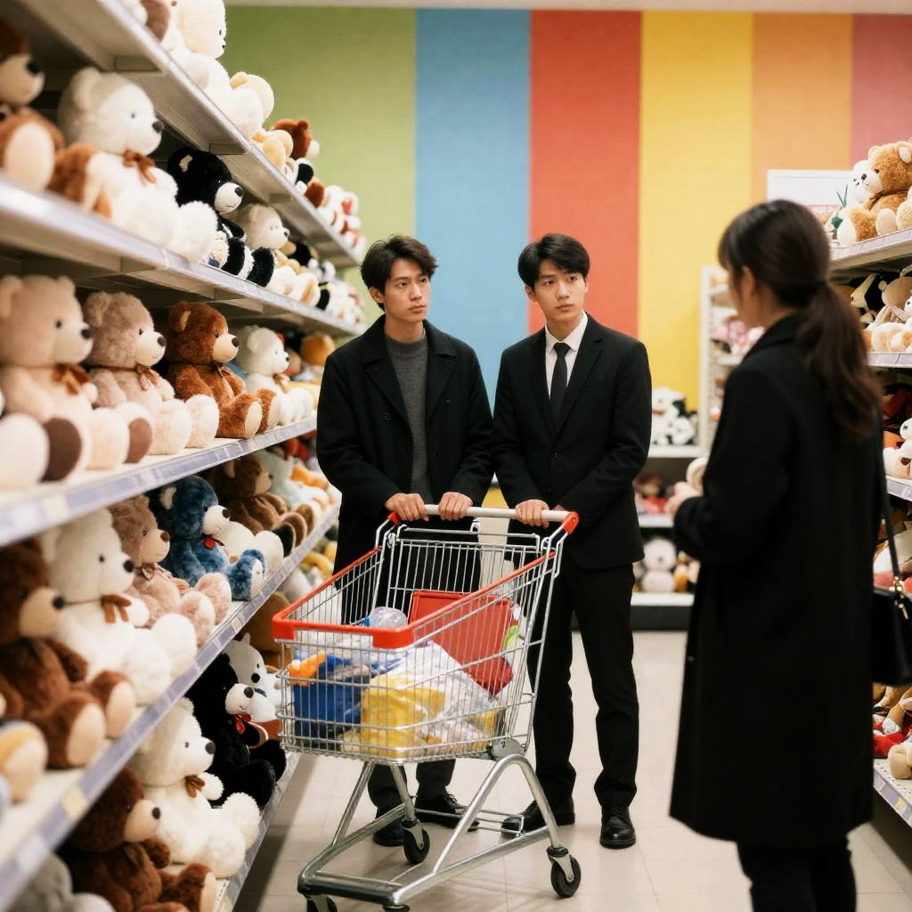 Photograph of a store aisle. Two men, one in a black coat and another in a black suit, stand near a shopping cart filled with items. Surrounding shelves are packed with stuffed animals. Woman in a black coat stands facing them. Brightly colored striped wall on the right. Stuffed animals include white and brown teddy bears. Both men have serious expressions. Woman's hair is tied back.