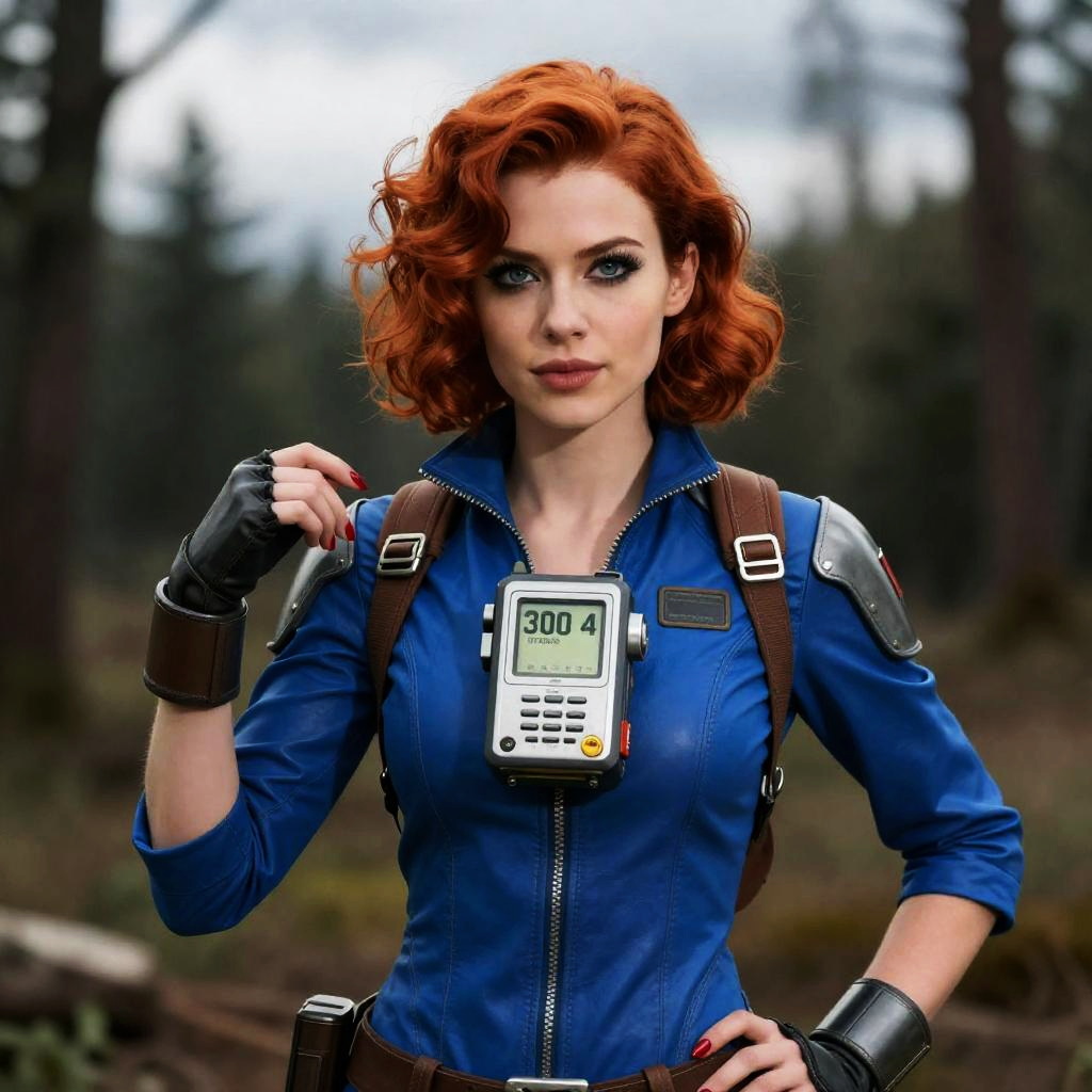 1girl, a girl with (short curly auburn hair:1.2) and dark blue eyes and pinup makeup wearing (blue vaultsuit with pipboy3000) posing with pipboy3000 and (her hand in her shoulder:1.2) in front of a forest, cloudy day, redhead, post apocalyptic, fallout, fallout 4, bethesda, bethesda art, vault girl, vault tec, 50s, cute face, younger face, beautiful slim model body, (beautiful red nails:1.2), atompunk, (atompunkstylesd15:0.25), ultra realistic, hyper realism, (realistic suit shading:1.2), shiny metal, wallpaper, intricate, sharp focus, rtx, professionally color graded, well drawn, masterpiece, ultra detailed, high quality, best quality, 4k, 8k