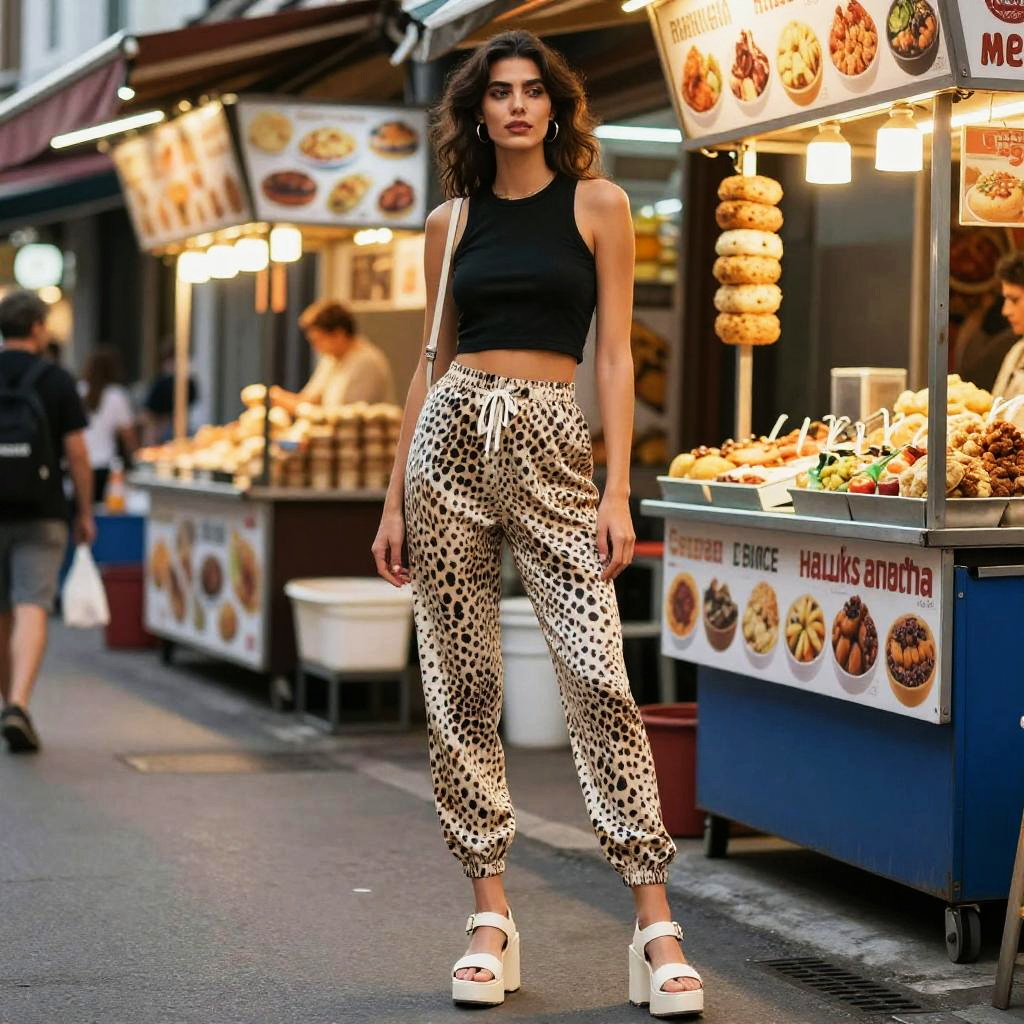 A tall woman in a hakusensha style, wearing a sleeveless black cropped tank top and light animal print jogger pants, stands at a gourmet street food stall in an Istanbul bazaar, enjoying the vibrant atmosphere. She pairs her look with chunky two-tone platform sandals and has minimalist makeup. Sexy. Pretty face and beutiful eyes
