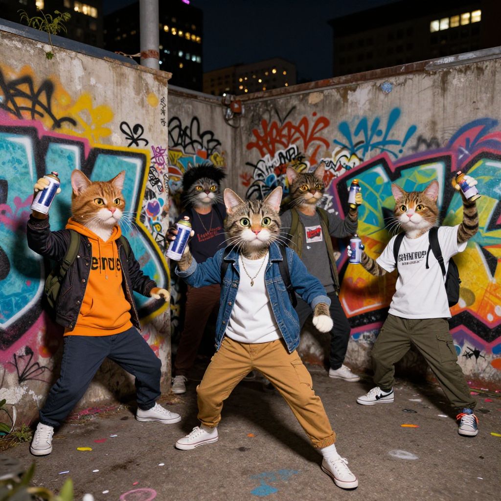 Humanoid cats as street artists in an urban environment, graffiti-covered walls with vibrant colors, characters expressing creativity and attitude, dynamic poses holding spray cans, casual streetwear blending feline and human traits, energetic and edgy nighttime city backdrop