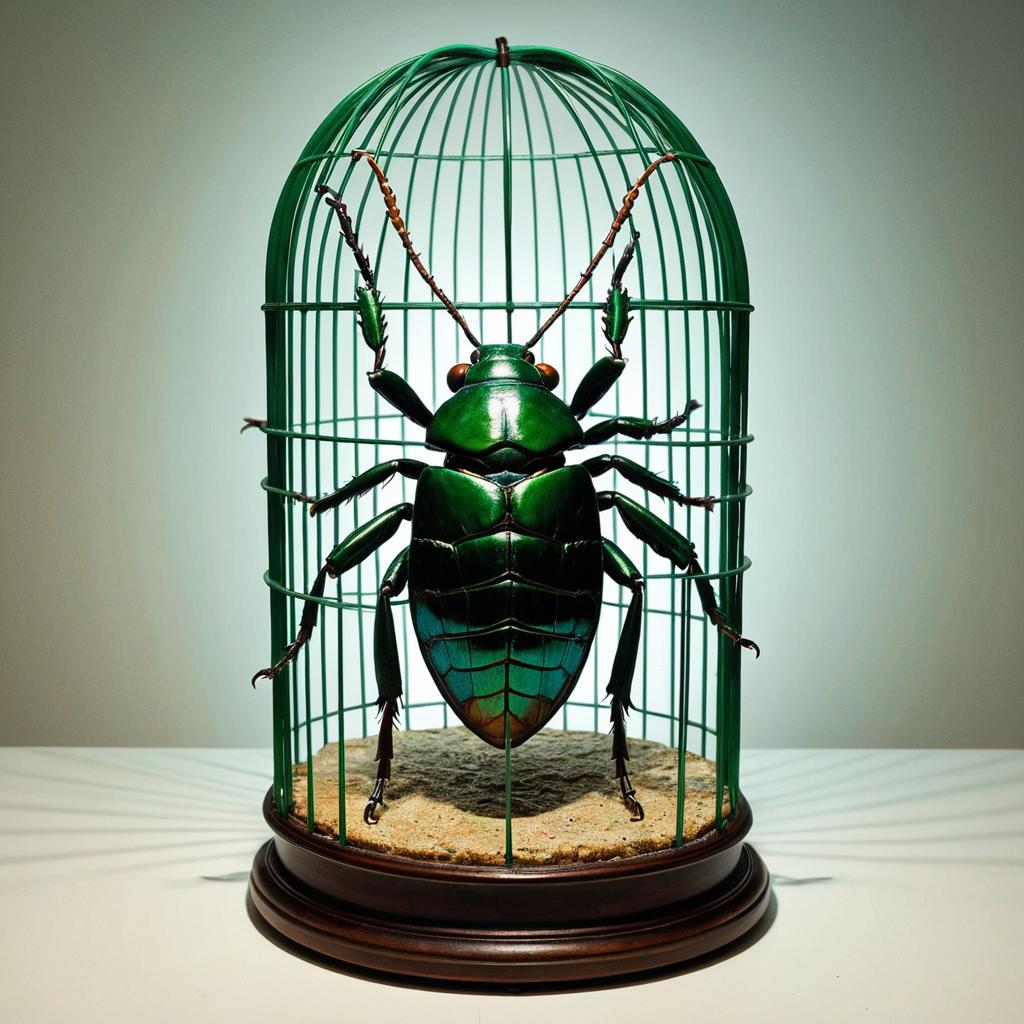 Hyperrealistic sculpture of a bronze fossilized cicada cockroach in a large cage made of green nylon wire and wax on a pedestal by ron mueck and duane hanson and lee bontecou, hyperrealistic dramatic colored lighting trending on artstation 8 k