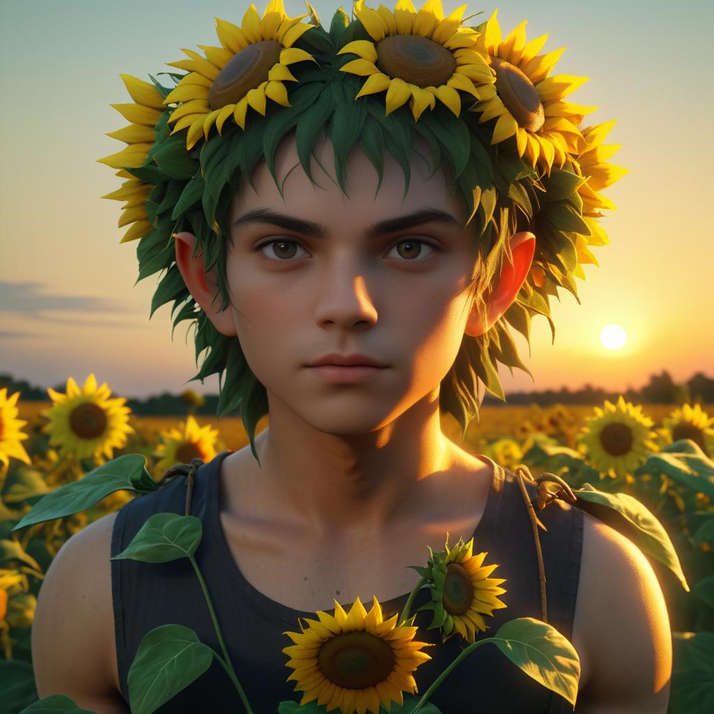 A film still portrait of a serious young troll with sunflowers growing from it, hyper-realistic, 8k, closeup on face with freckles, sunset in background, gapmoe yandere grimdark style, trending on pixiv fanbox